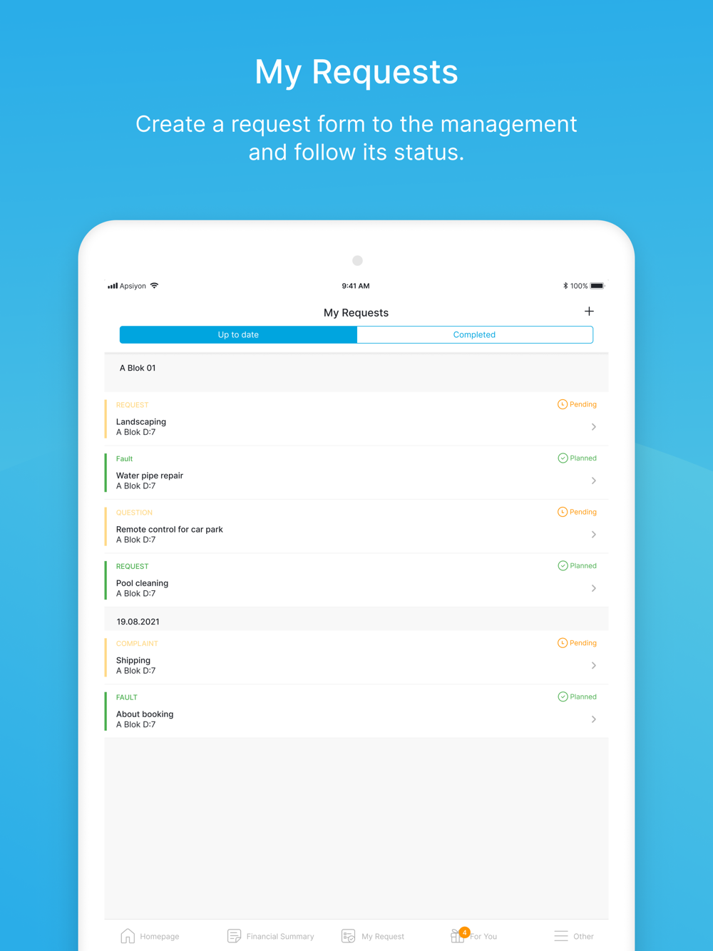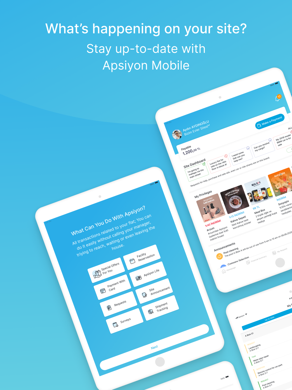 Apsiyon provides professional and digital solutions to collective living space managements such as apartments, sites, residences and business centers, and ensures complete and practical management for all living spaces. In addition, with its mobile application developed for the site residents using Apsiyon, it enables to easily make and follow all transactions. Thus, it makes the life easier for the site residents using Apsiyon.