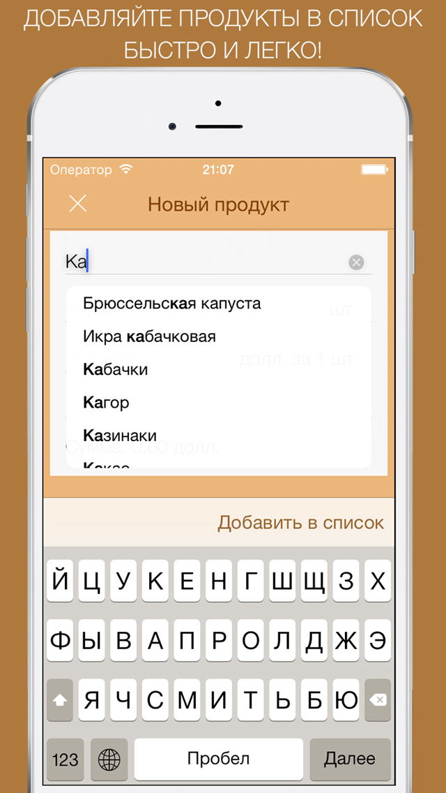 - Авто-подбор по первым двум-трём буквам продукта поможет составить список покупок быстро и легко!;