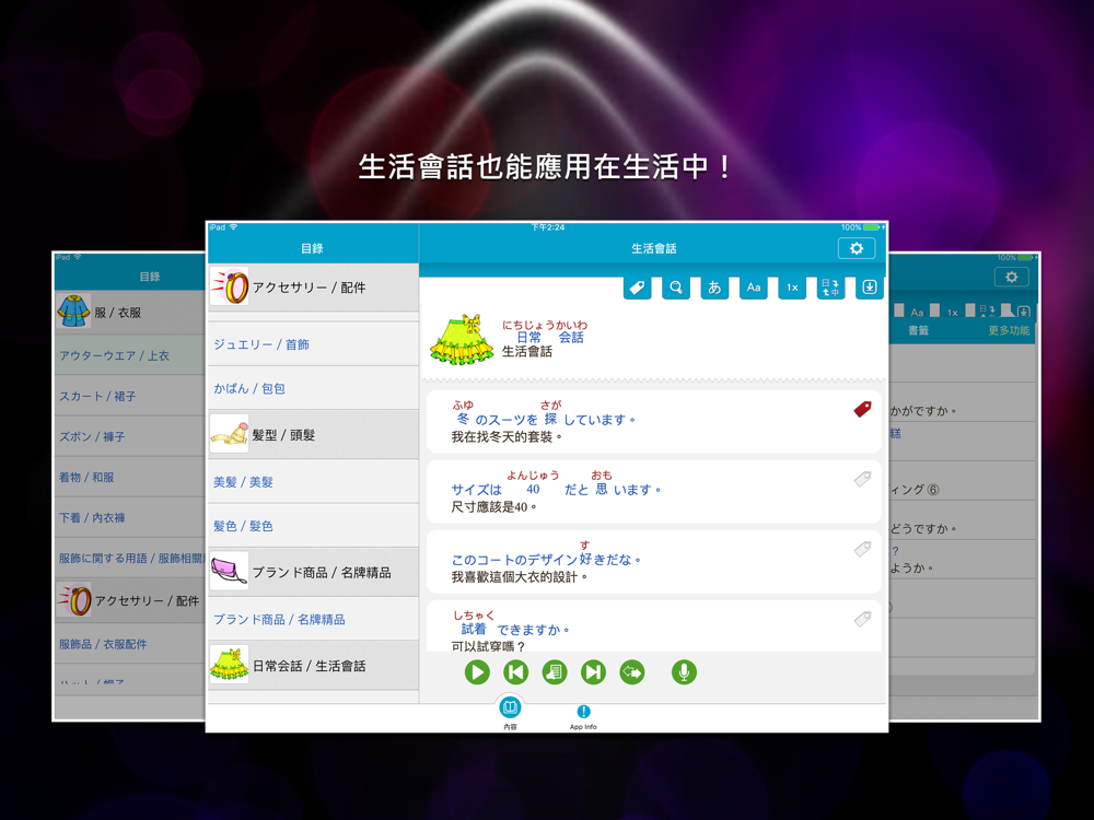 『日語單字速讀』系列 App 將生活當中最常用到的日語單字,按照食、衣、住、行四個大主題分別製作,以生活化、超細緻的分類法,徹底貫徹「相關單字歸納一起,分項收錄、一次吸收」的快速學習原則,讓使用者能以更有效率的方式記憶並找尋相關單字,並以清爽、簡潔的版面讓使用者方便操作,達到即選即用的目的。