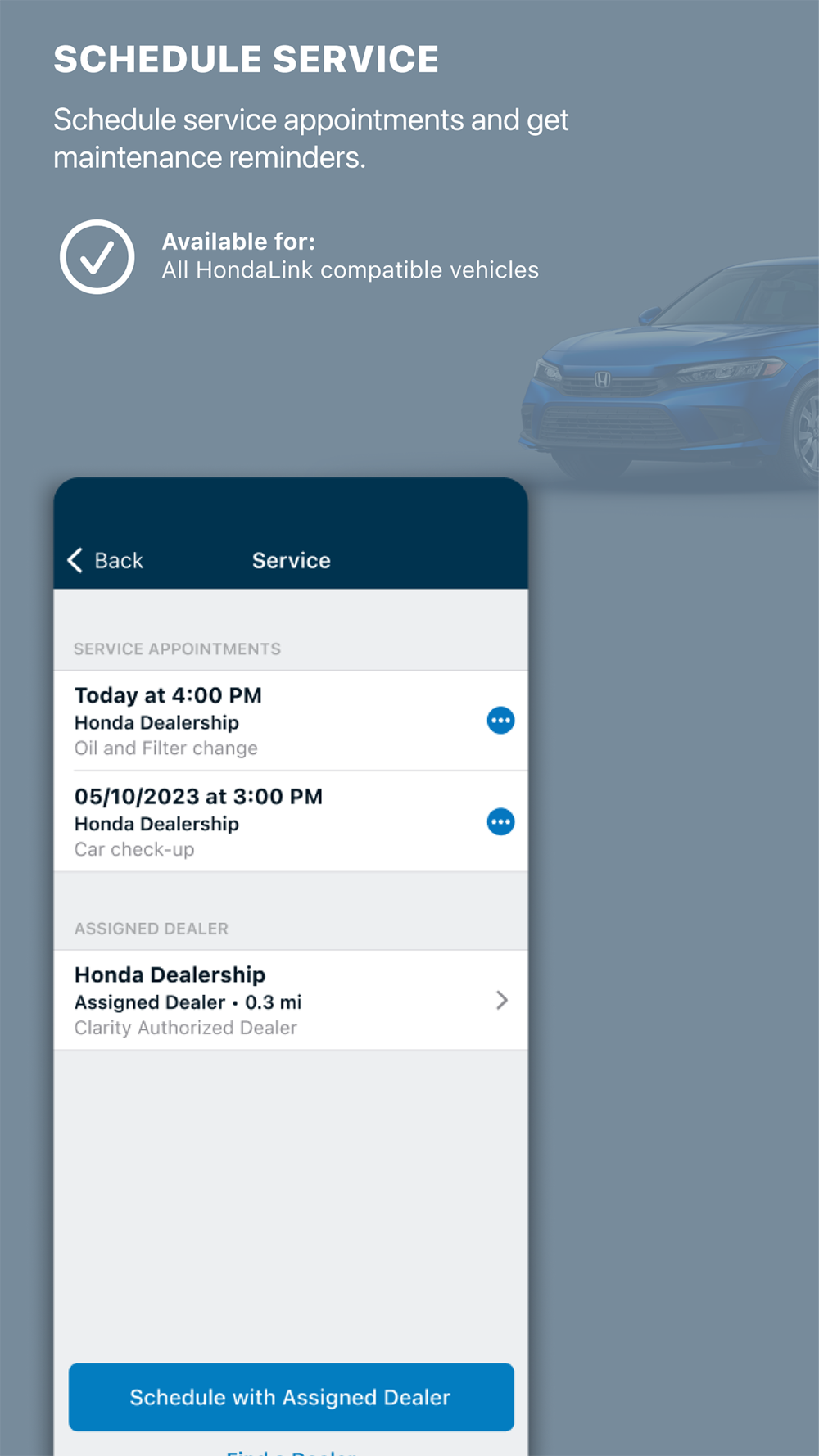 Use HondaLink® with compatible Honda vehicles to access features, such as scheduling service appointments, roadside assistance, and more. Please visit https://mygarage.honda.com/s/hondalink-product-compatibility to learn more.
