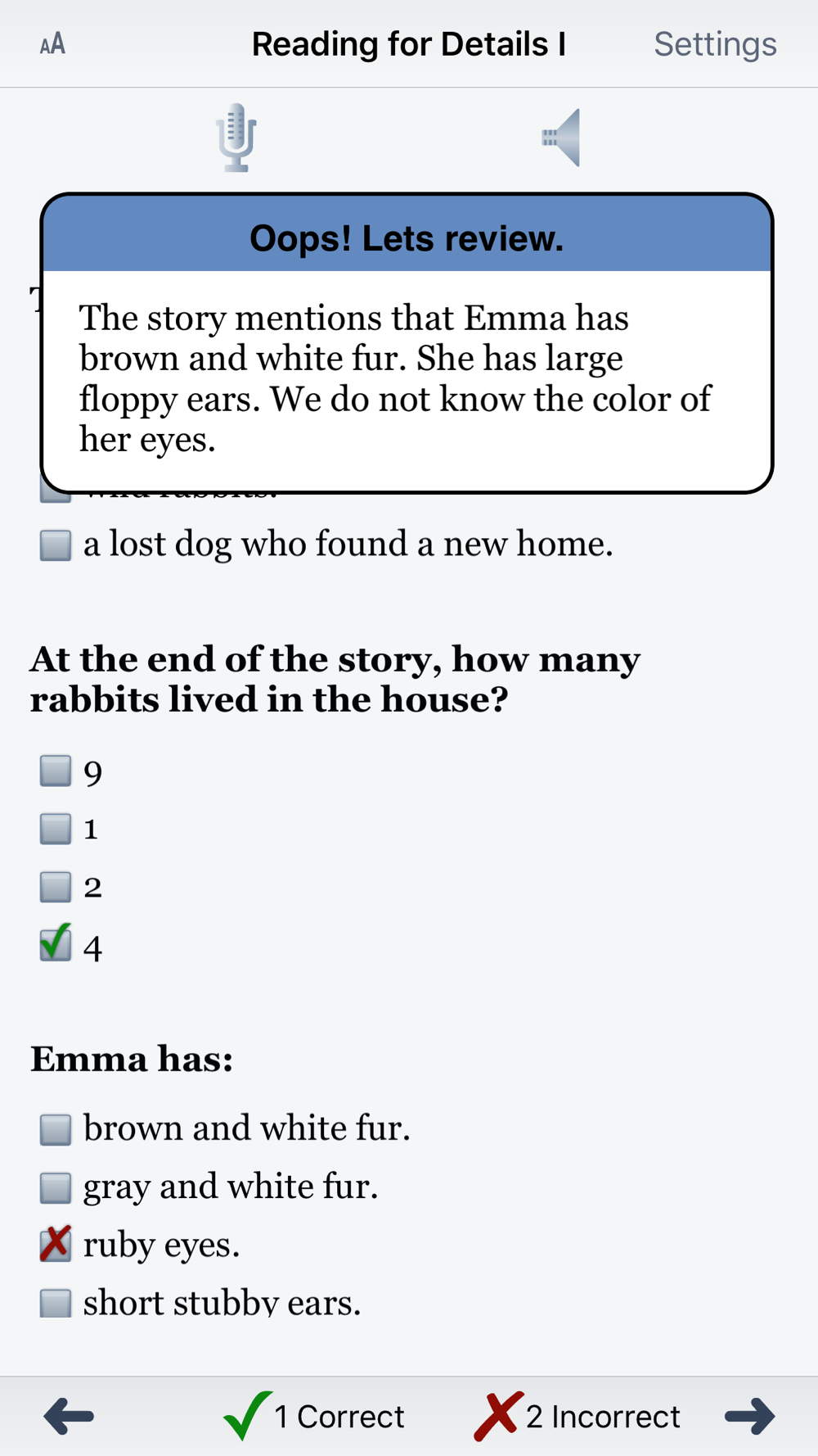 Students often get a question wrong because they focus on a specific detail. Sometimes they recognize words or numbers in the answers and choose an answer because the words are familiar. A popup explains why incorrect answers may appear to be correct. It also explains why the correct answer is, in fact, the right choice. After the student studies the explanation, they should read the question again and answer it using the knowledge gained from the explanation. They can swipe back to the story, reread it, and look for the answer. An option lets them choose to see the explanations after each answer, rather than just after incorrect answers.