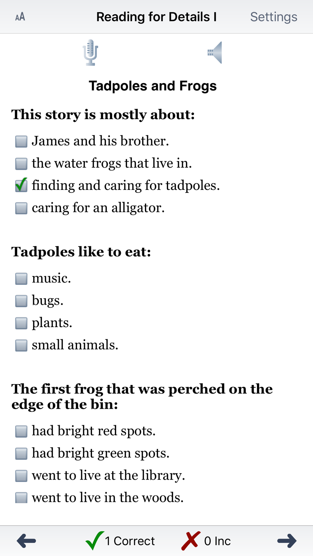 The Reading for Details series of apps were designed for individuals who need extra practice with reading comprehension. Their focus is on learning how to recall specific details of the stories. They are also appropriate for children and adults with traumatic brain injuries or stroke. Ideally, the student will work with a parent, teacher, or therapist while using the app. The mentor can guide the student’s reading strategies while using the app as a source of stories and questions.