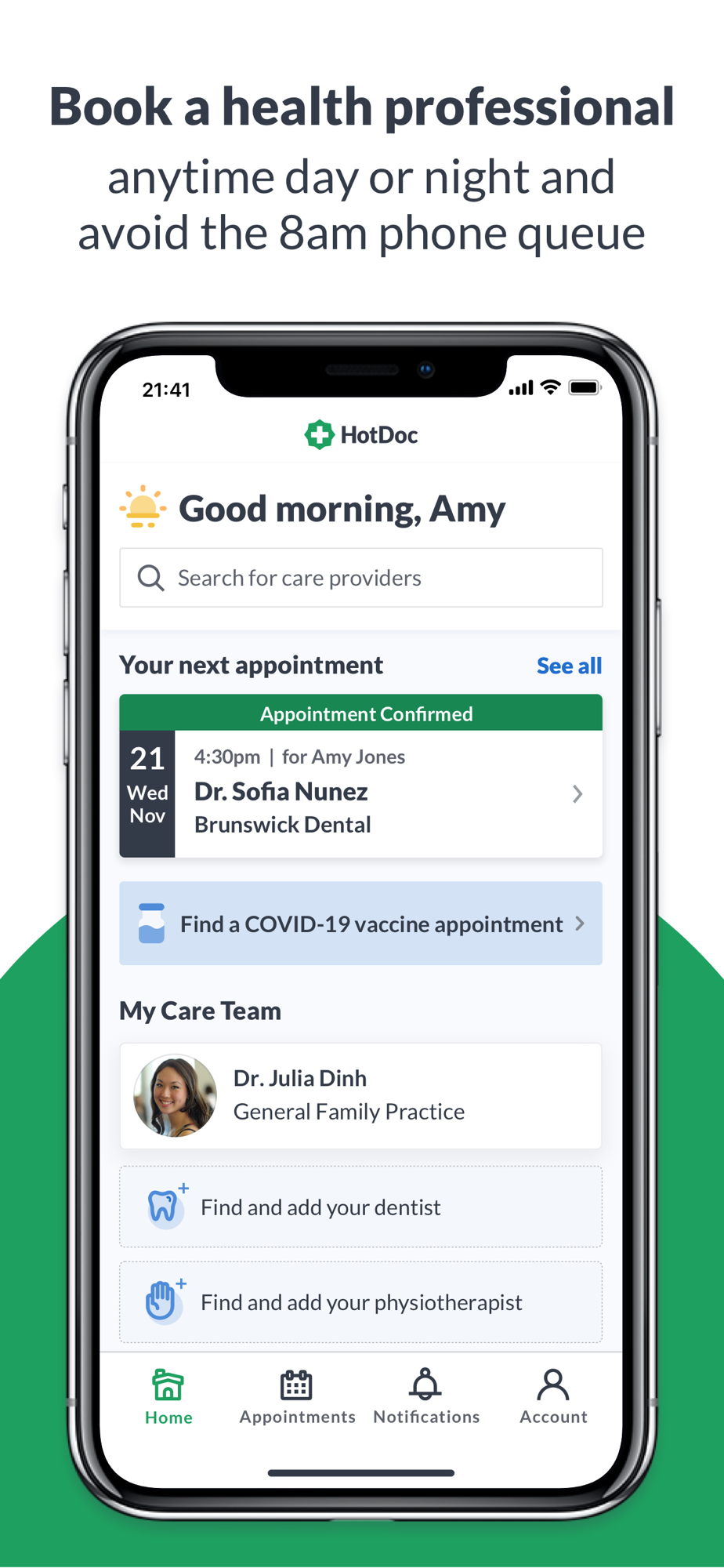 Using HotDoc, you can book and manage your appointments with health professionals anywhere, at any time: