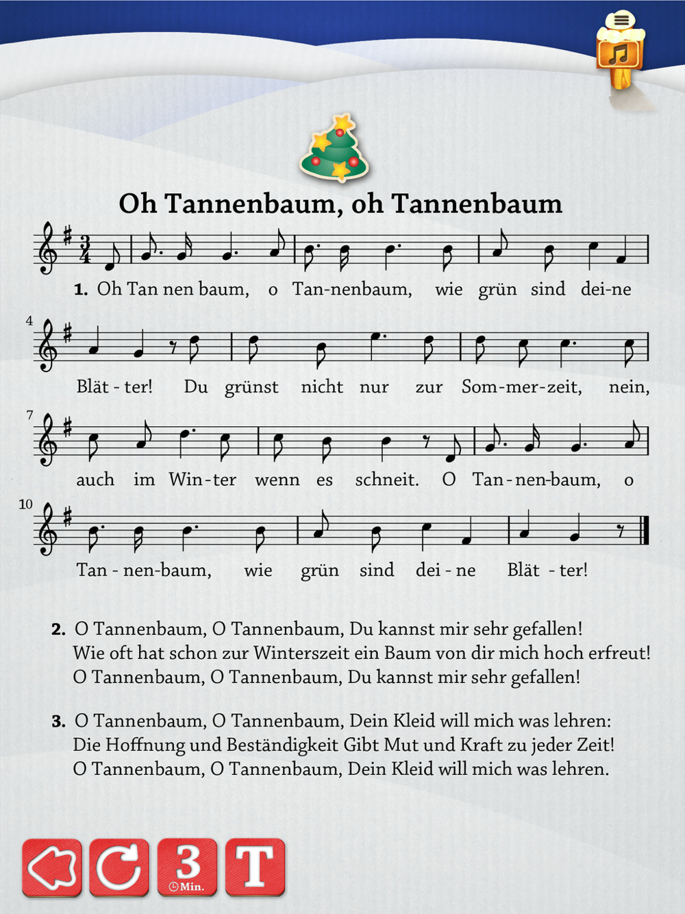 Wir laden Sie, Ihre Kinder und die ganze Familie herzlich zum gemeinsamen Singen ein! Die 12 bekanntesten deutschen Weihnachtslieder haben wir für Sie in einer App zusammengefasst – mit Noten, Text und allem, was dazugehört.