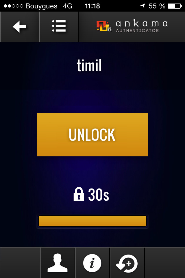 Any time you want to link your account to one of our games (DOFUS, WAKFU or KROSMASTER) or sites, you must first launch the app and press the ‘Unlock’ button. This simple action authorises you to log on for a period of 30 seconds. After this period is over, nobody can access your account.