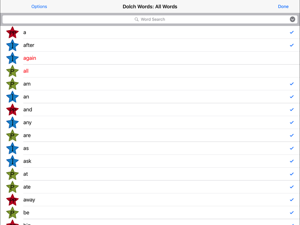 Each of the words is classified by grade level and ability. Dolch Beginner focuses on words for children in preschool, kindergarten and first grade. It includes the Dolch lists for Pre-Primer, Primer and First. It also includes a customize option that allows you to select words that your student or child is focusing on in their study.