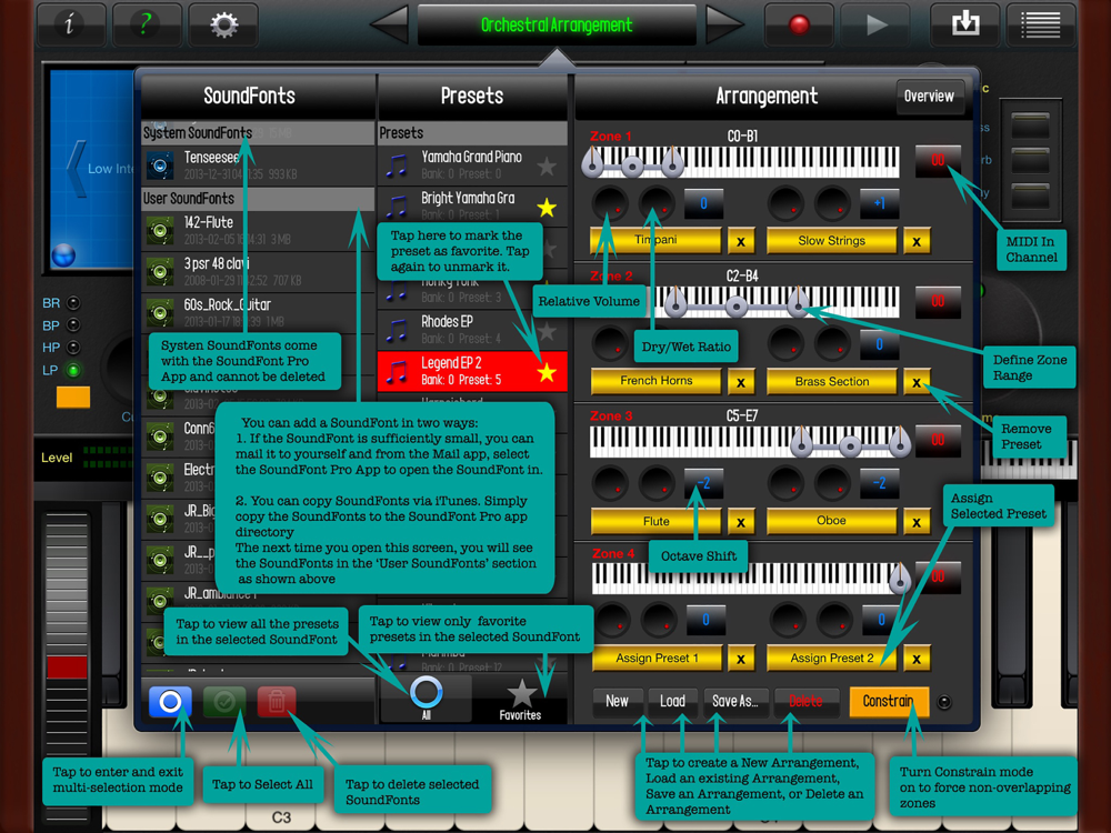 SoundFont Pro is multi-timbral, multi-layered, and multi-zonal. This means that you can take an ordinary MIDI keyboard and assign key-ranges on the keyboard to different presets from different soundfonts and play the resulting arrangement much as you would play an arranger keyboard! Or set up different zones and assign input MIDI channels to receive MIDI from an external controller or from another MIDI app to specific zones.