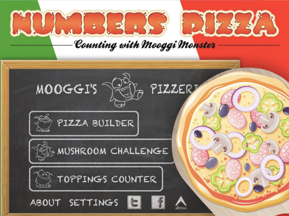 Start off by helping Mooggi add toppings to pizzas that have been ordered in his pizza shop. Mooggi tells you how many of each topping is needed and you drag the toppings and build the pizza. Each time a topping is placed, a number appears on top and a group of kids shout out the number to reenforce the count. Next, move on to the Mushroom Challenge. Mooggi will toss a pizza slice in the air with up to 7 mushrooms on it. You’ll need to quickly count the number of mushrooms and select that number at the bottom of the screen. Each time an answer is correct, a group of kids shout out the number to reenforce the count. Get 10 right in a row and Mooggi will add more time to play. Finally, move on to the Toppings Counter. Help Mooggi take a topping inventory of his pizza shop. He will display up to 99 toppings and you simply count them. Each time a topping is counted, a number appears on top and a group of kids shout out the number to reenforce the count.
