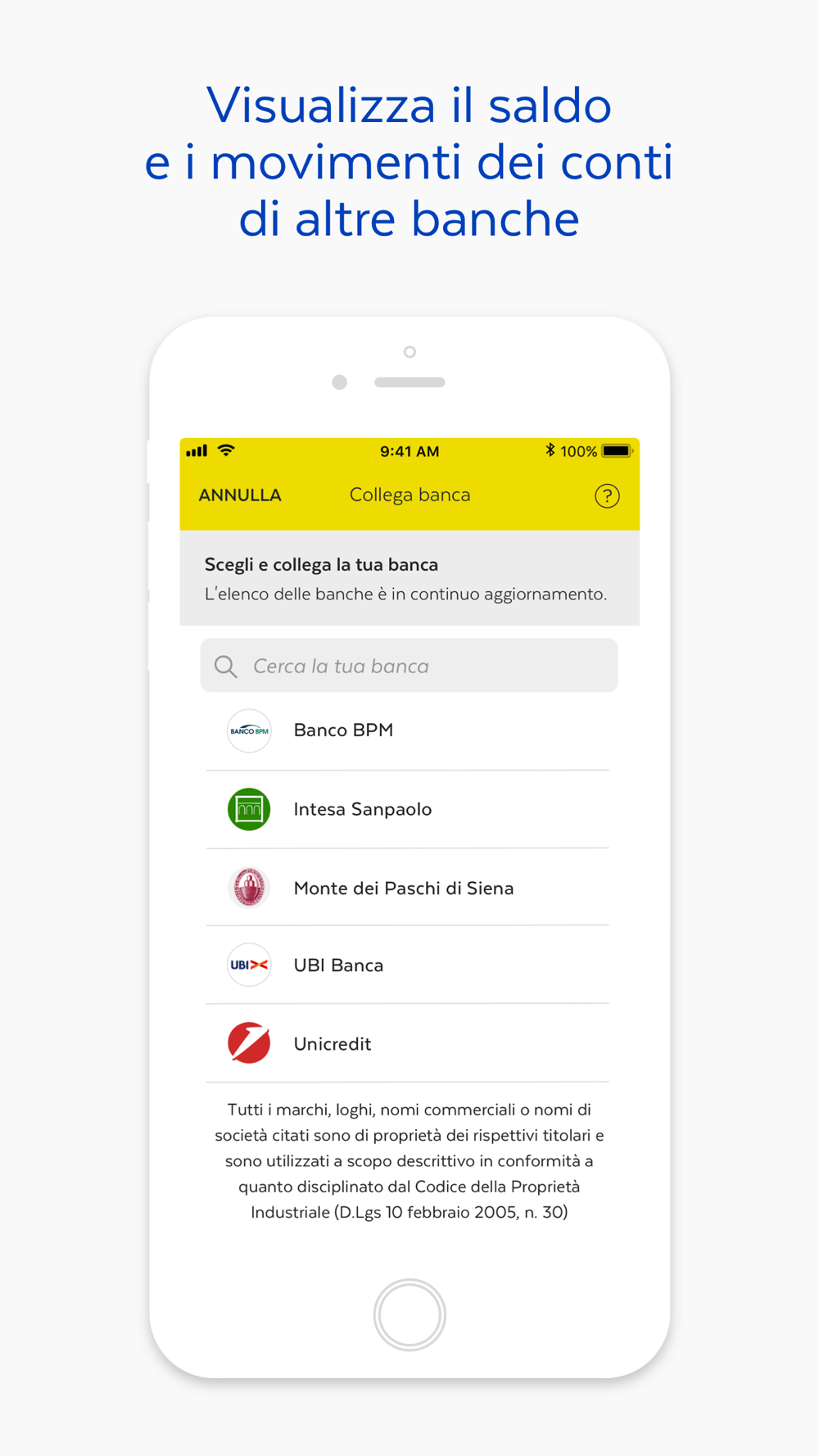 • Saldo e lista movimenti dei conti e carte di pagamento di altre banche (servizio di informazione sui conti – AIS)