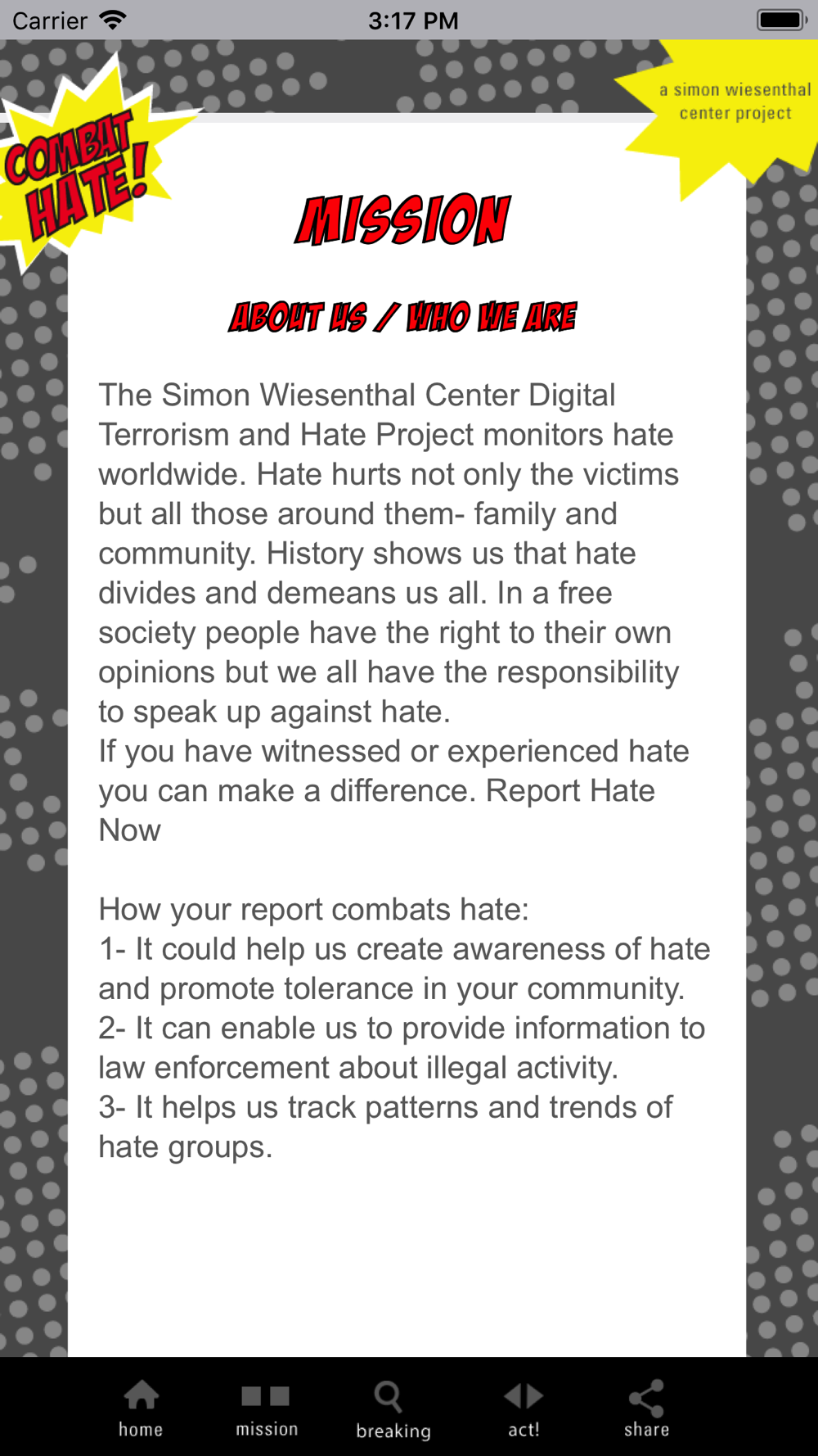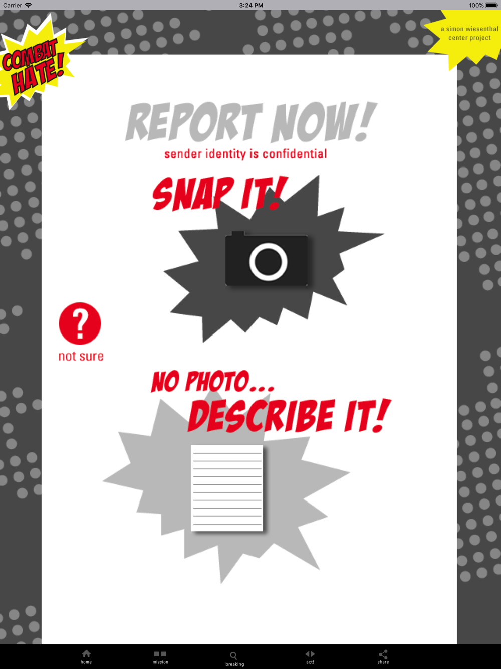 CombatHate is the first-of-its-kind application designed to empower young people to confidentially report a hate crime, hate incident or online hate to the Simon Wiesenthal Center, a leading human rights organization.