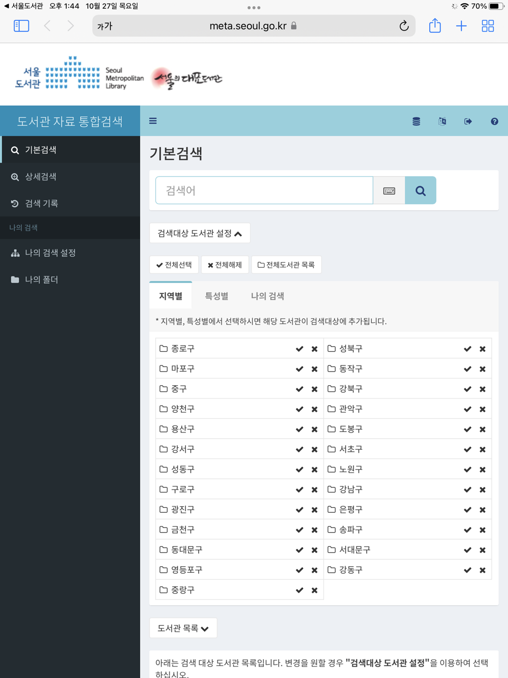 - 통합도서검색 : 서울의 다양한 도서관에서 소장하고 있는 자료들을 지역별, 특성별로 검색할 수 있습니다.