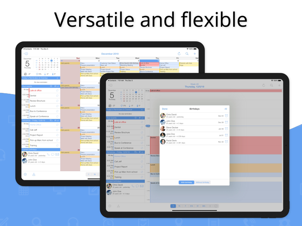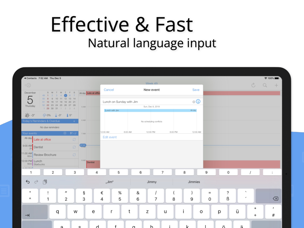Intuitively navigate through your calendars and quickly, easily add events and tasks thanks to predefined settings and simple controls. Standard settings like repeating events and reminders/alarms are just a tap away. And powerful special settings are also available, without sacrificing comfort or control. Swipe through views and open events or days with just a tap.