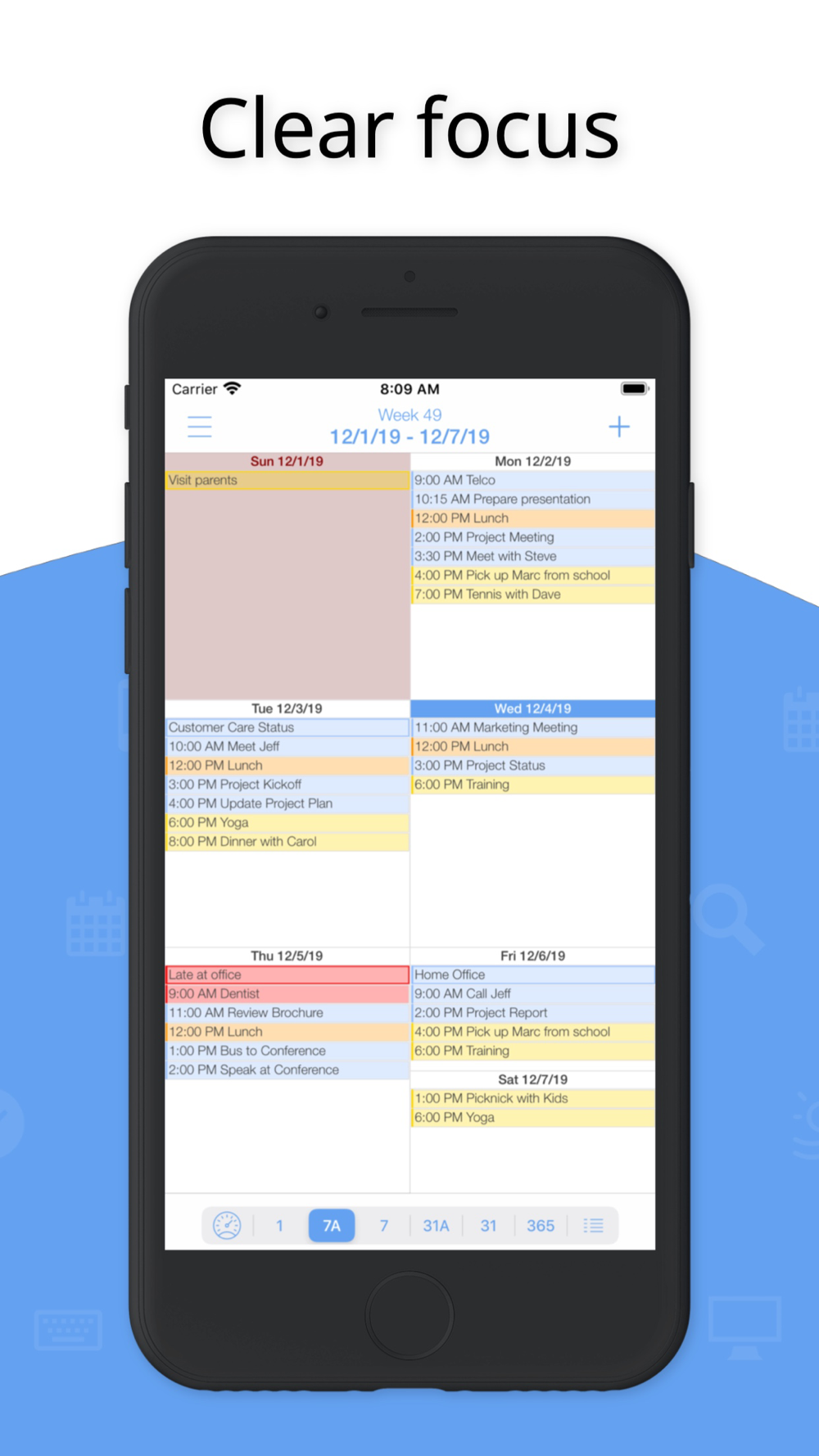 miCal provides complete, well-organized day, week and month views and displays the calendar week in all the important views.