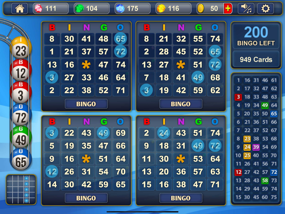 The object of the game is to complete a Bingo pattern, such as a line with five numbers vertical, horizontal, diagonal row or all four corner squares.