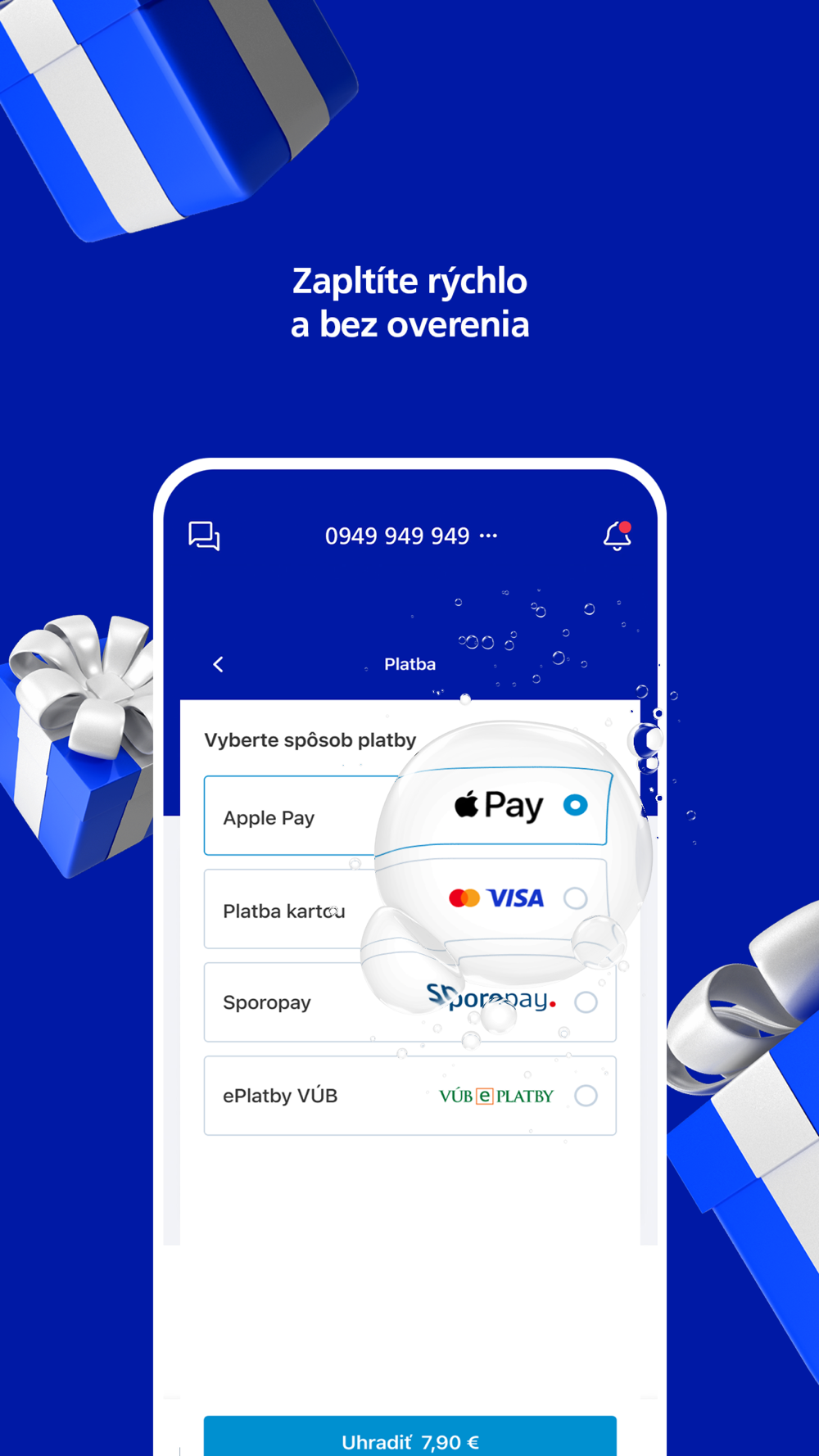 - uhradiť faktúry alebo dobiť kredit kartou alebo cez Apple Pay