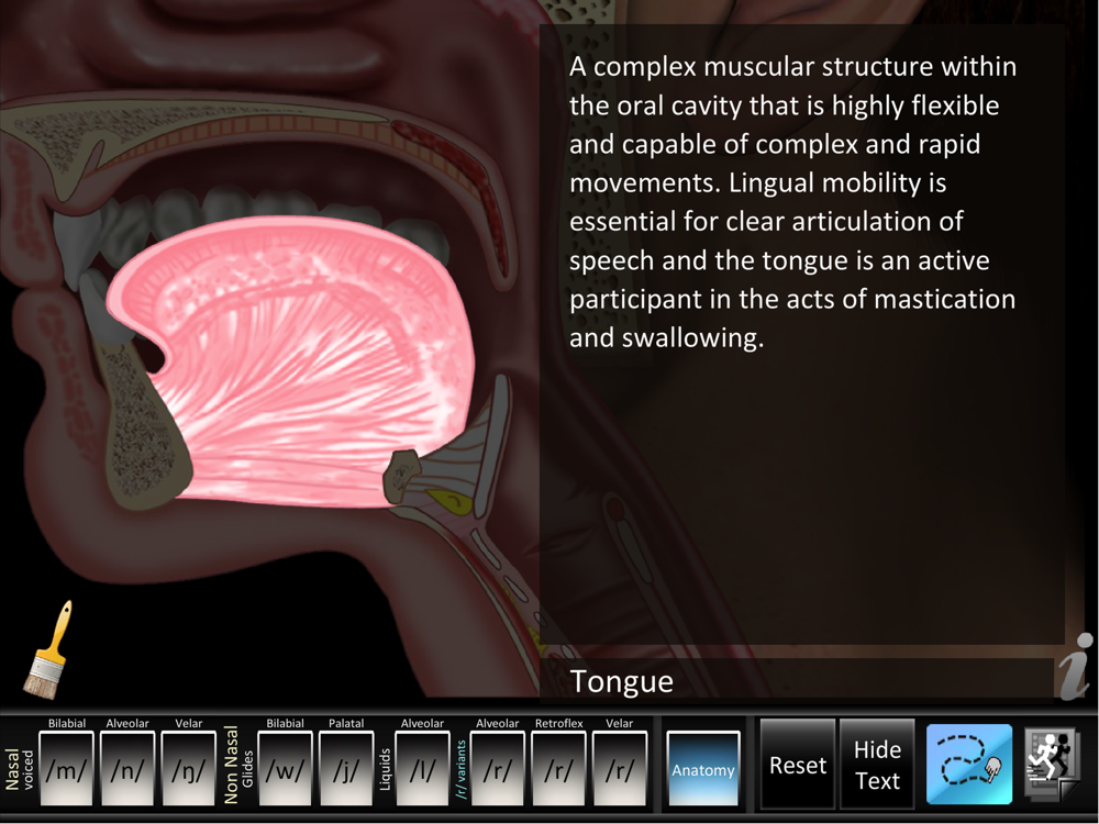 • Animations: each consonant shows a lateral view of dynamic movements of the jaw, lips, tongue, velum (soft palate), and larynx needed for proper articulation of that consonant. Audio for each consonant sound is synchronized with the dynamic animations. Anatomy animation included.