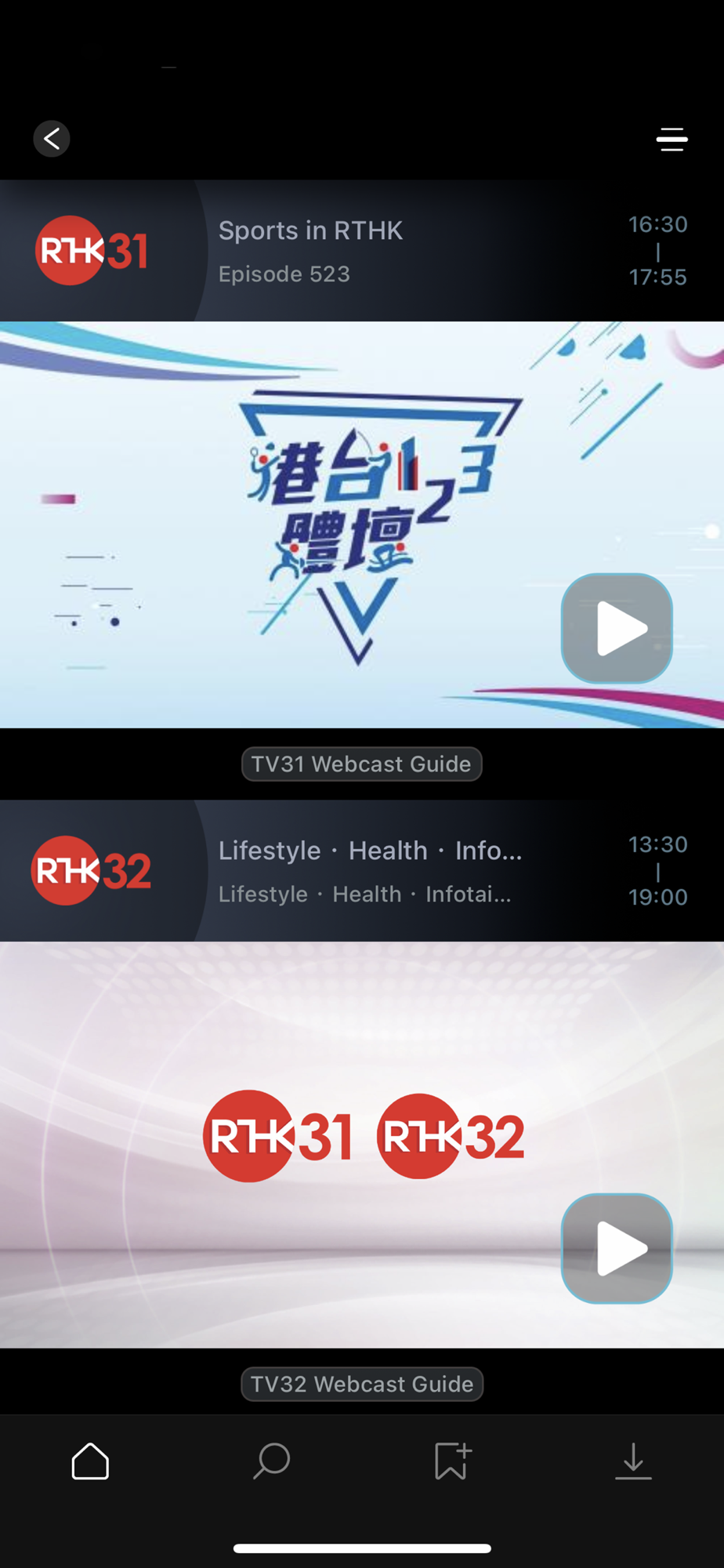 2) VoD and download: "RTHK TV" offers a video-on-demand (VoD) feature that allows you to watch our RTHK TV 31 and TV 32 programmes any time you like. You may also use the download function to pre-load our programmes to 'My Downloads' in the app for subsequent watching.