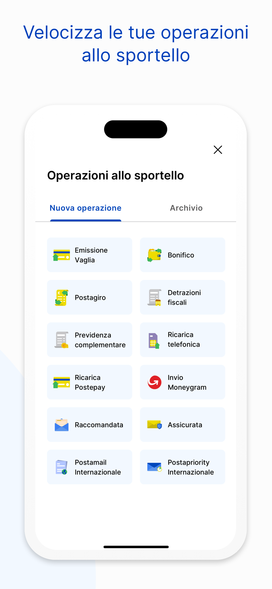 • Velocizzare le tue operazioni a sportello: compila in app i dati richiesti e risparmia tempo presentando il QR code, concluderai più rapidamente trasferimenti di denaro, ricariche telefoniche, ricariche delle carte prepagate Postepay e invio di corrispondenza