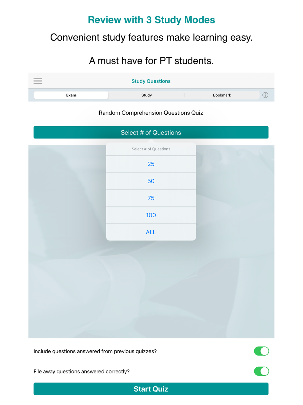 •Study/Exam/Bookmark modes are available for NPTE-style review questions.