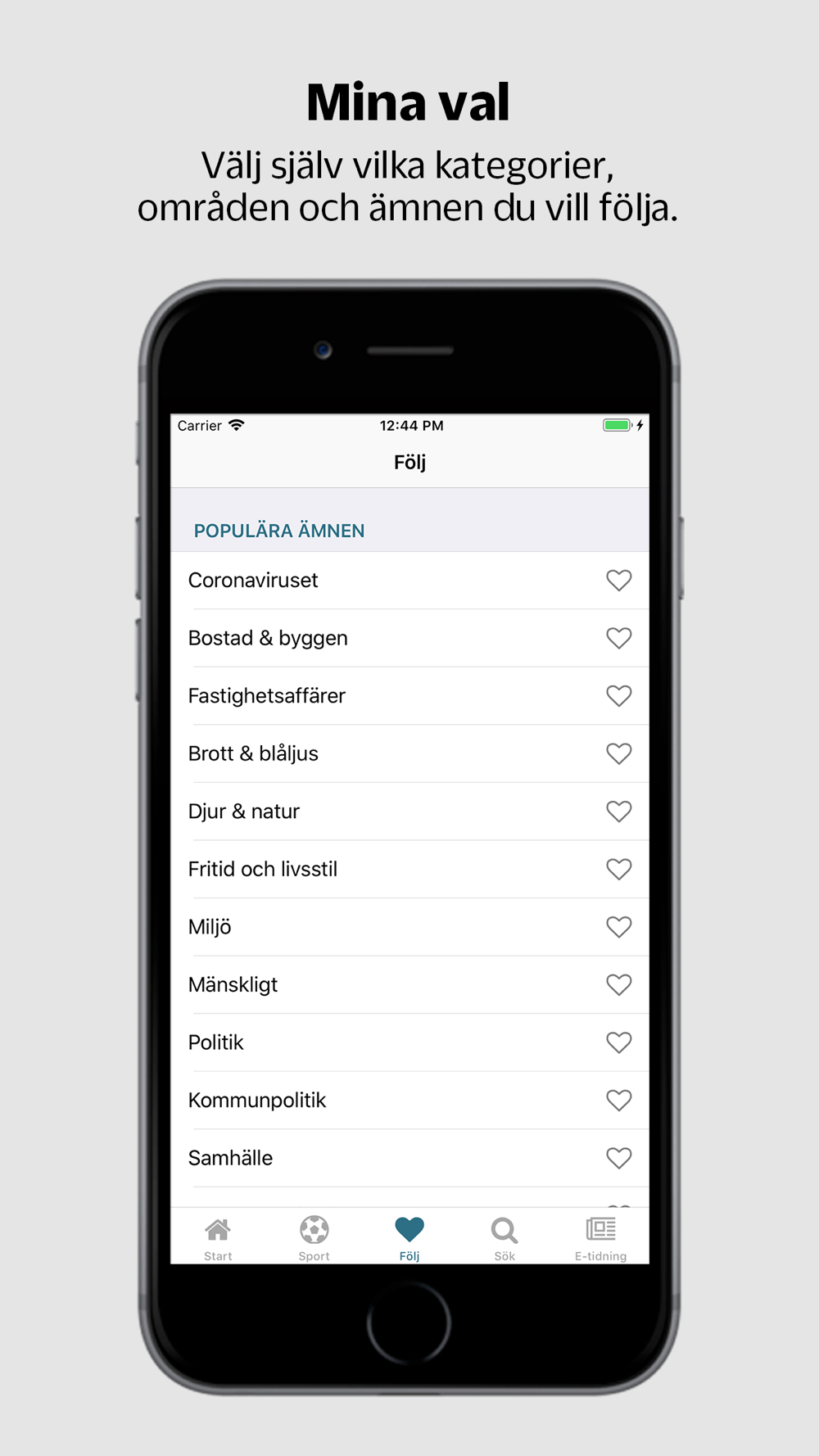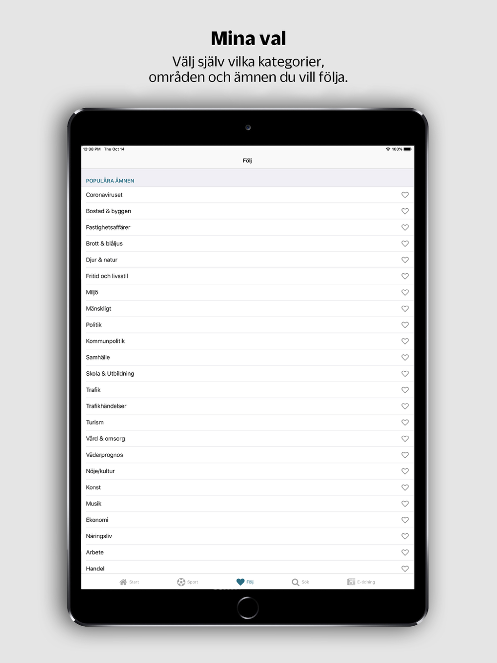 Med funktionen "följ" kan du enkelt bli notifierad vid händelser som intresserar dig. Välj själv vilka kategorier, områden och ämnen du vill följa genom att klicka på hjärtan. Du kan när som helst ändra dina inställningar.