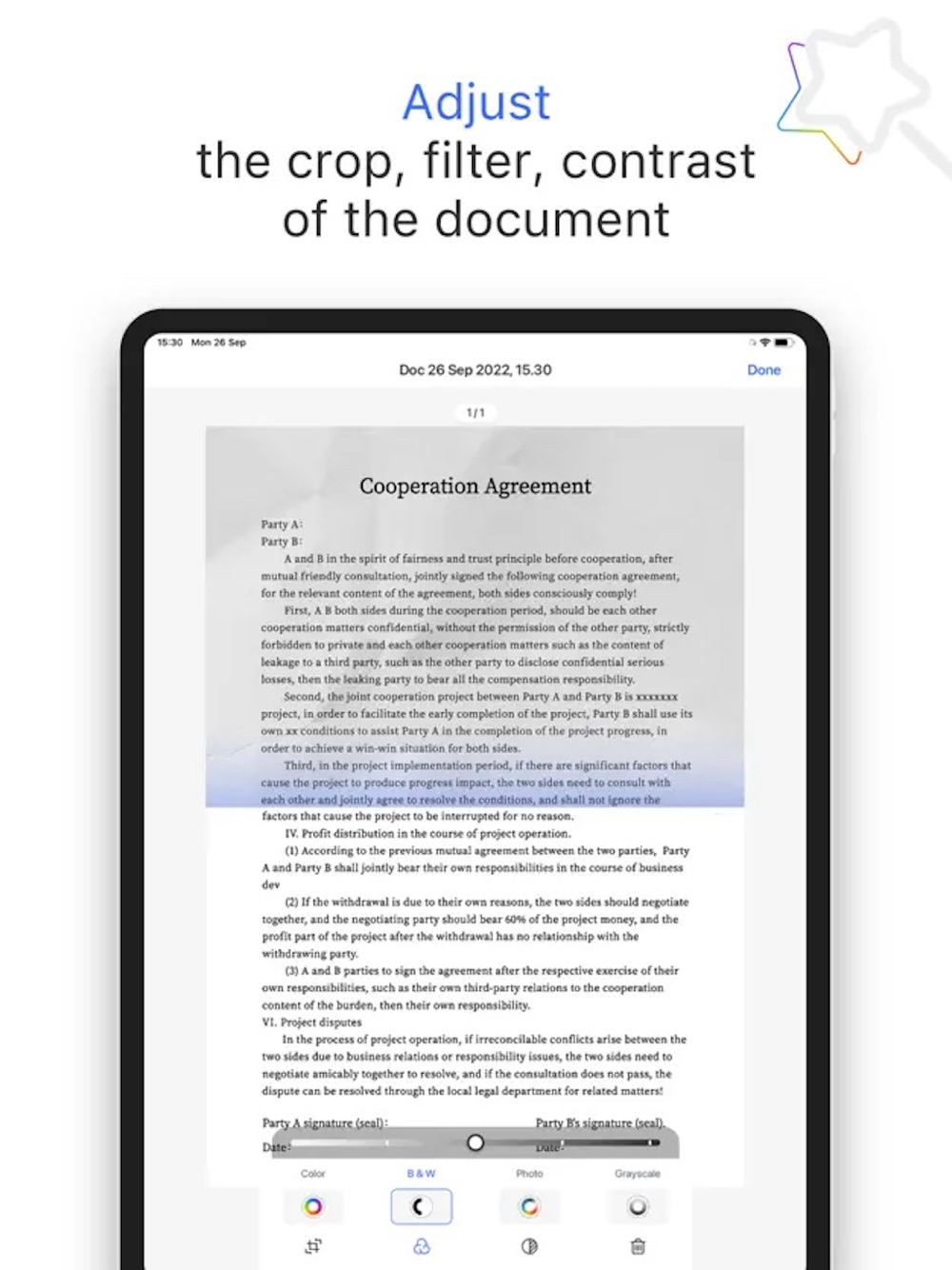 Automatic edge detection and advanced image processing help you to get great scans blazingly fast. You can also adjust the crop area manually, by tapping on the screen.
