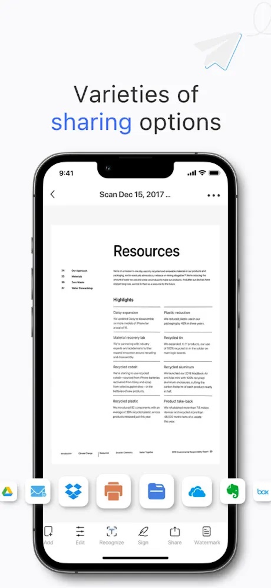 Scanner Pro scans any type of document, ranging from a receipt to multipage documents. All scans are saved as a PDF.