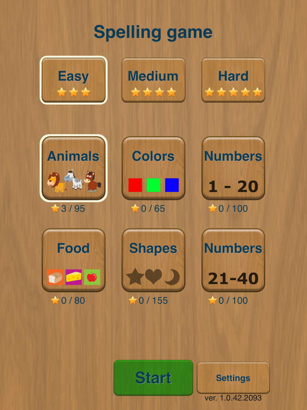 It features three levels of learning and practicing spelling - Easy, Medium and Hard.