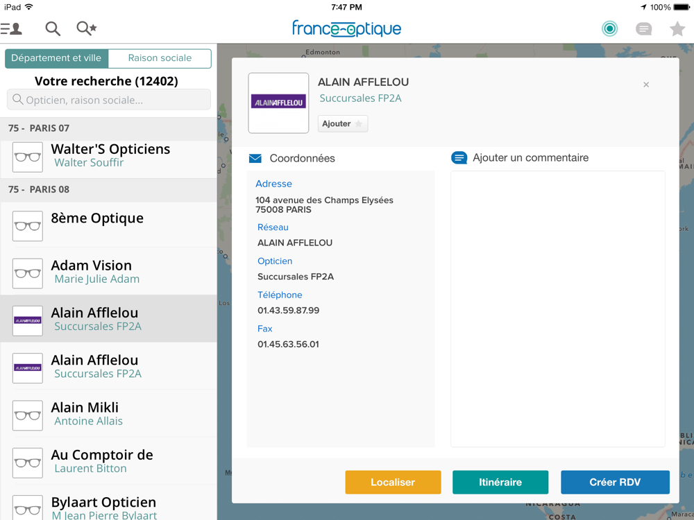 Cette application met à disposition un annuaire géo-localisé des opticiens en France métropolitaine et Outre-mer. Véritable outil pour les forces de vente, elle permet sur la fiche opticien de la mettre en favori, de poser un rendez-vous, et de laisser un commentaire.