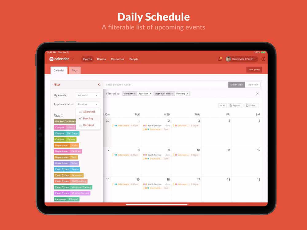 Planning Center Calendar is the place to manage your master event schedule and track rooms and resources. Simplify collaboration for event scheduling and setup, all while managing them in real time. Avoid scheduling conflicts, reserve rooms, and publish event calendars and kiosks for your building. Know where your resources are, when they're being used, and how many you have. Add people to approval groups and require approvals for any room or resource request.