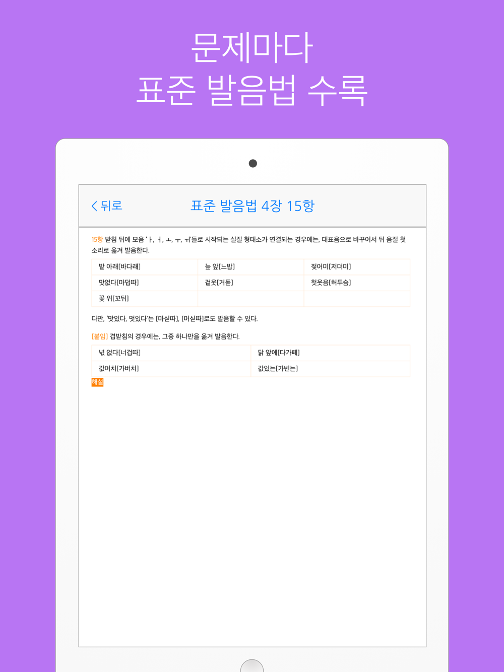 각 문제에는 표준 발음법이 해설로 실려 있어 우리말 발음법의 원리와 원칙을 쉽게 파악할 수 있습니다.