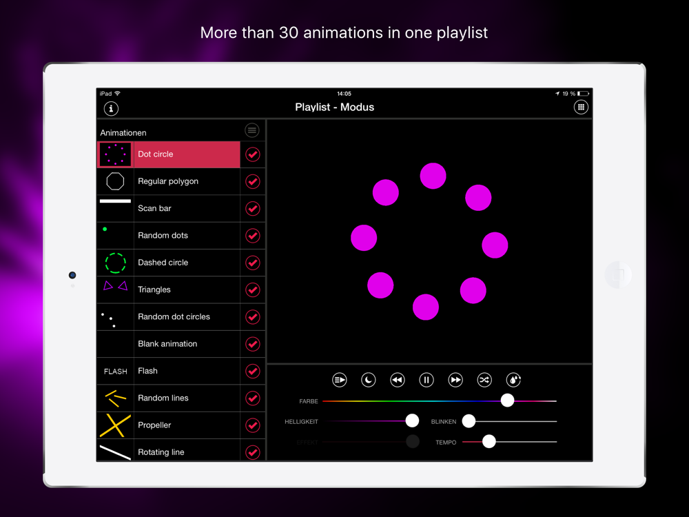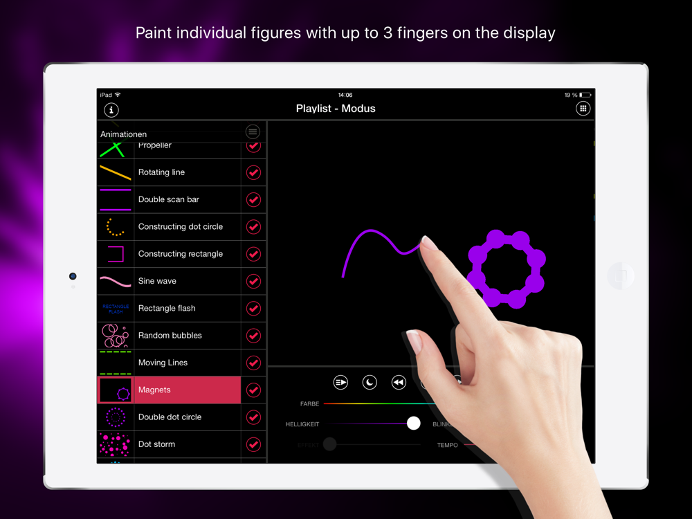 Our effort, keep it simple! Choose your favourite animations, activate them on the playlist and start your own show. Change the speed, effects, color and brightness of each animation to get more variety. Other features are live drawing, playlist mode for stand-alone operation and automatic color change.