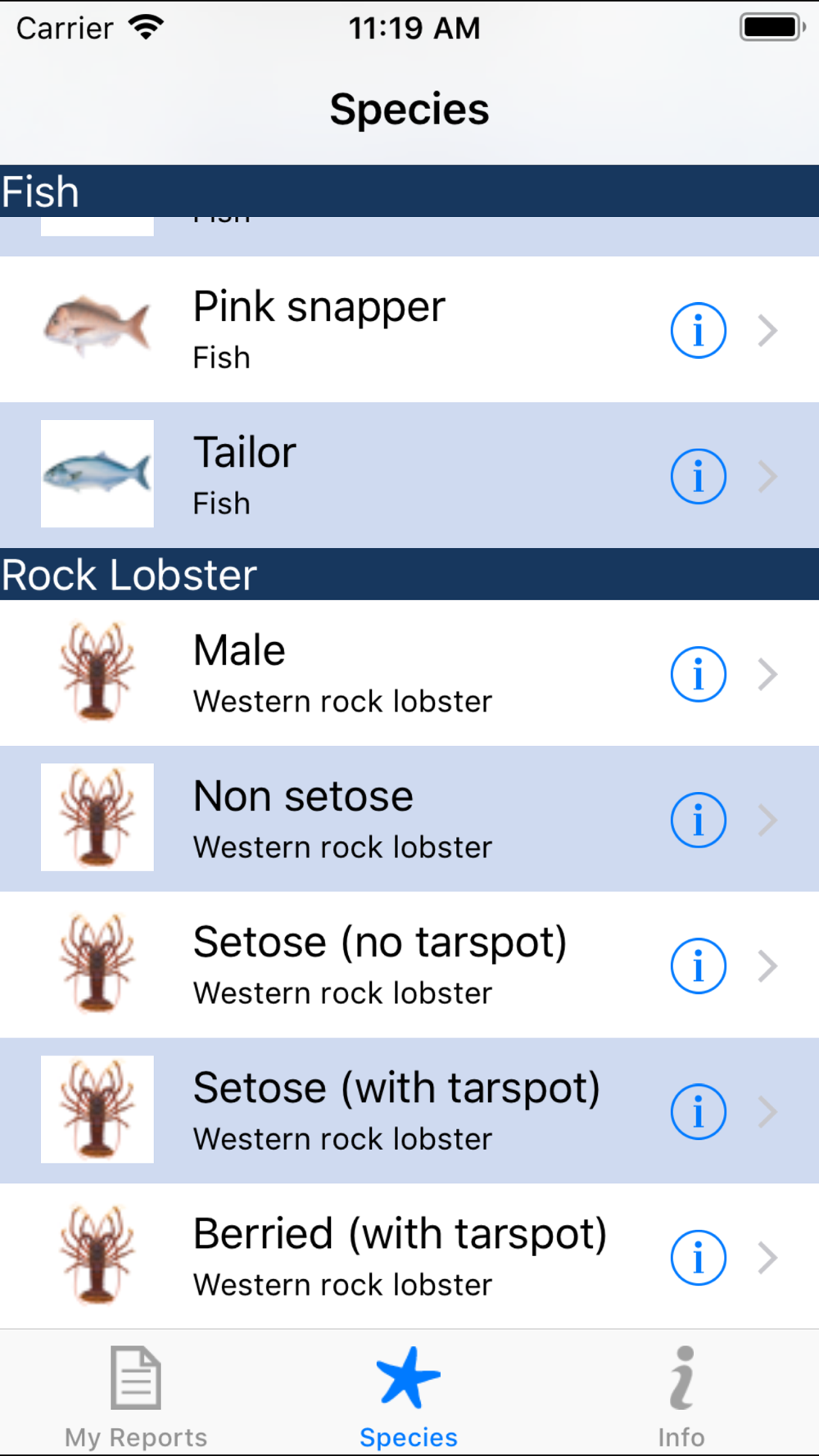 Breeding status (rock lobster and crabs only) – We need to know what stage of the breeding cycle the tagged animal is at. The Species screen will assist you in identifying this information if you are unsure.