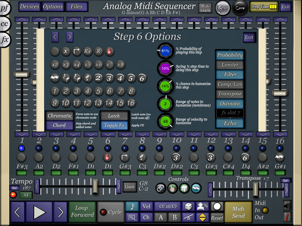 With the addition of chords, each step can also send out up to 128 note chords. You can create your own chords by using a on-screen keyboard or pick common ones such as the dim7.