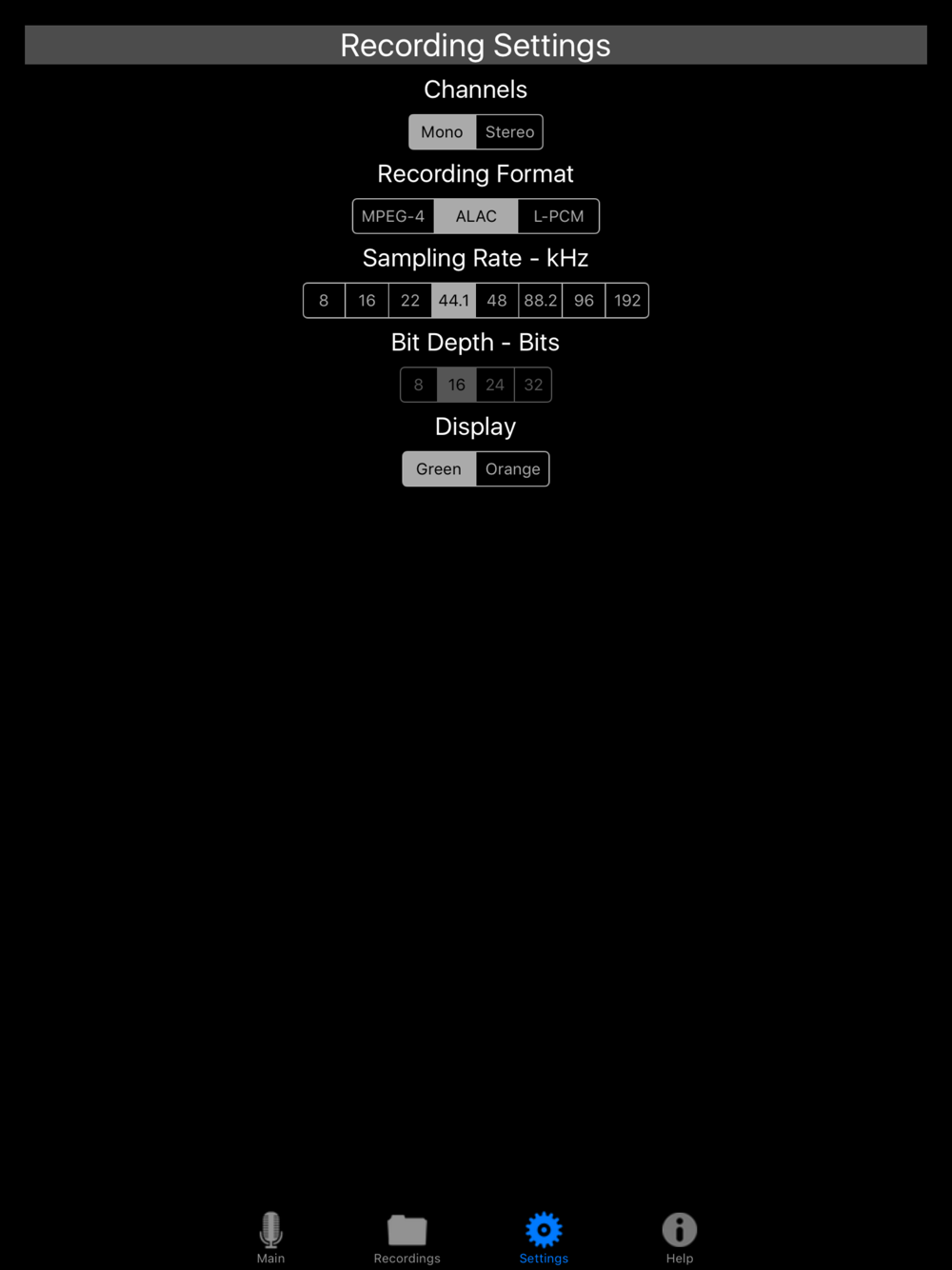Records great mono or stereo audio in these popular formats, MPEG-4 (AAC) as m4a files, Apple Lossless Audio Codec (ALAC) as caf files, and Linear PCM as wav (WAVE) files. All industry standards and readily editable with your favorite software.