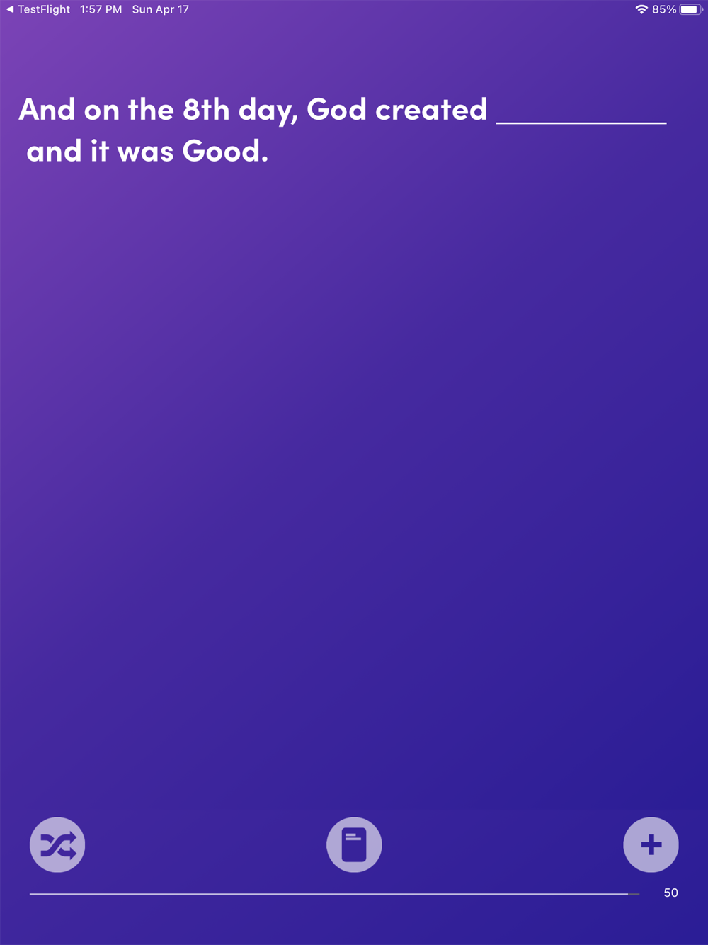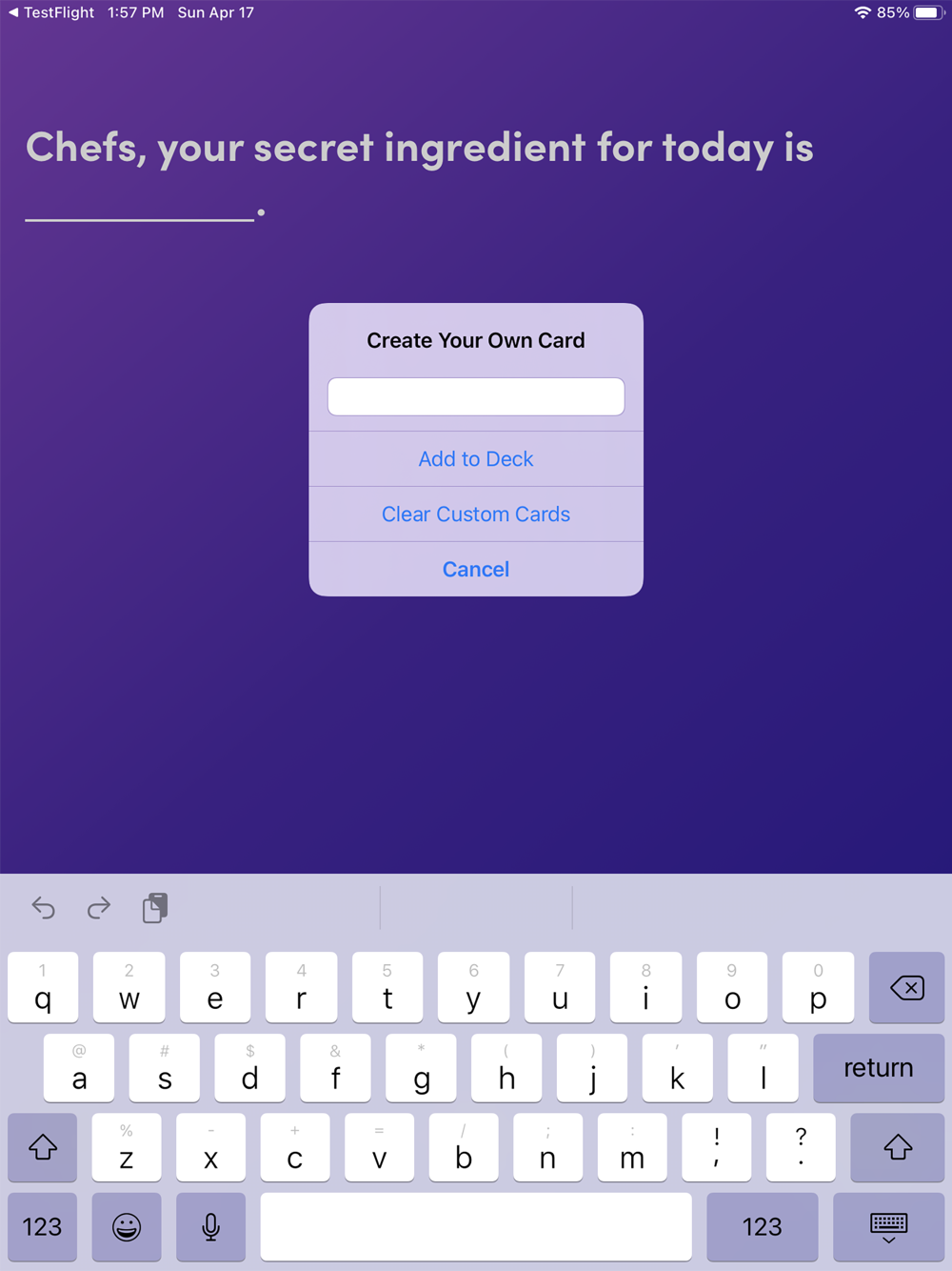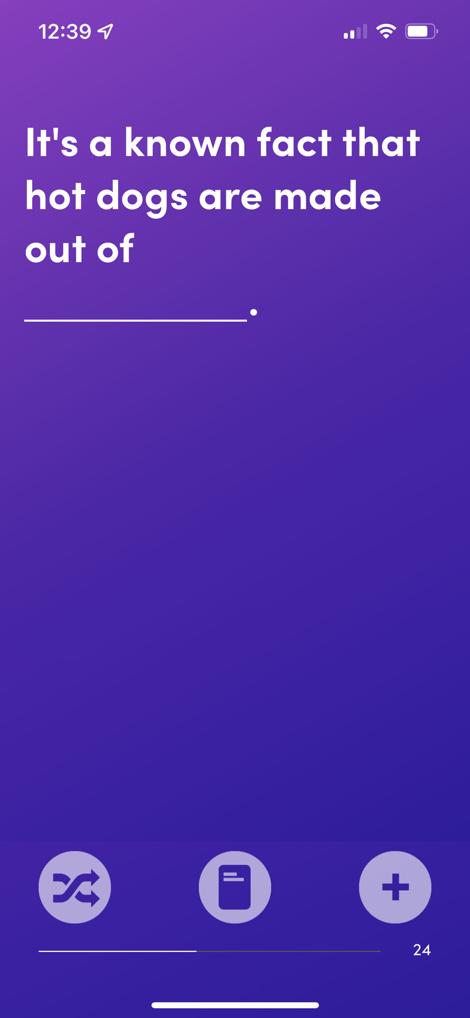 ____ Cards has a simple interface designed for maximum visibility and ease of use. Simply tap the screen for a new card when it's your turn. Read the card aloud and let users fill in the blank with the cards in their hand.