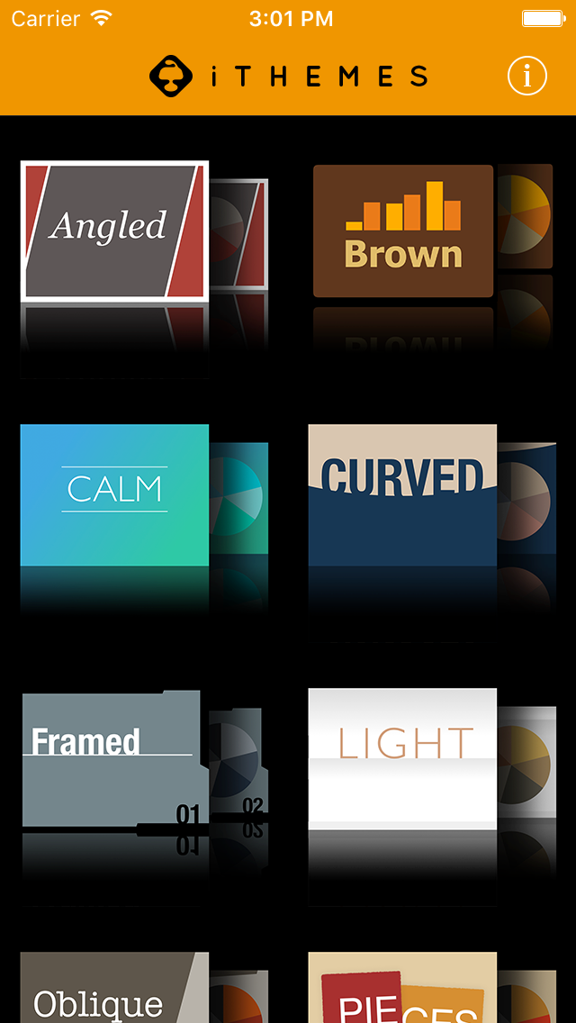 "iThemes for Keynote" offers a set of 14 professionally designed, high quality and easy to use themes for Keynote. All themes come in two sizes (1024x768 and 1920x1080) and include 20 master slides (12 standard and 8 additional), custom designed matching tables and charts.