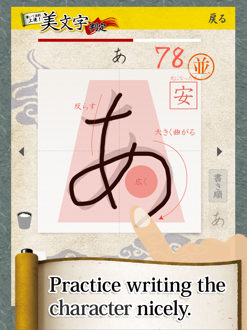 ・In the hiragana practice, the original kanji are also displayed for reference, so you can deepen your understanding of hiragana by practicing while visualizing the kanji.