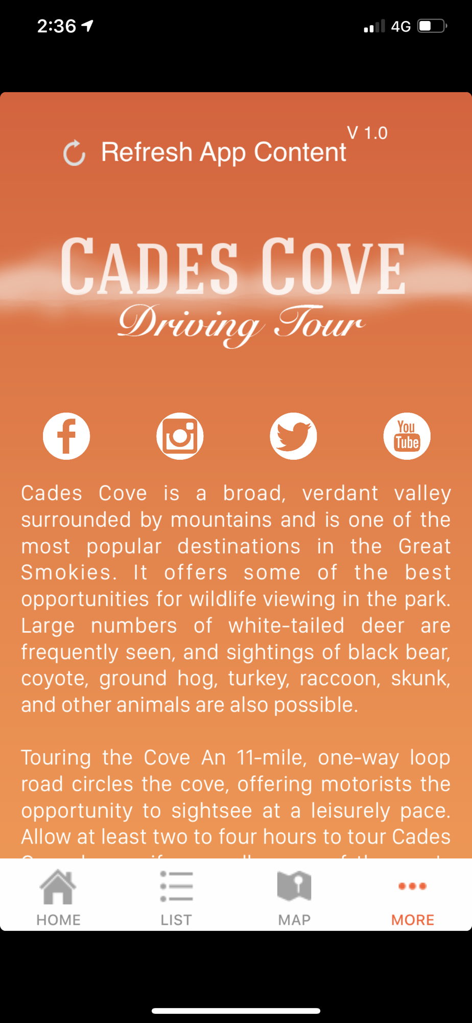 This driving tour mobile app will take you through the history of Cades Cove. With GPS mapping, voice narration and historical photos this app will guide you through this beautiful area, full of wildlife and history.