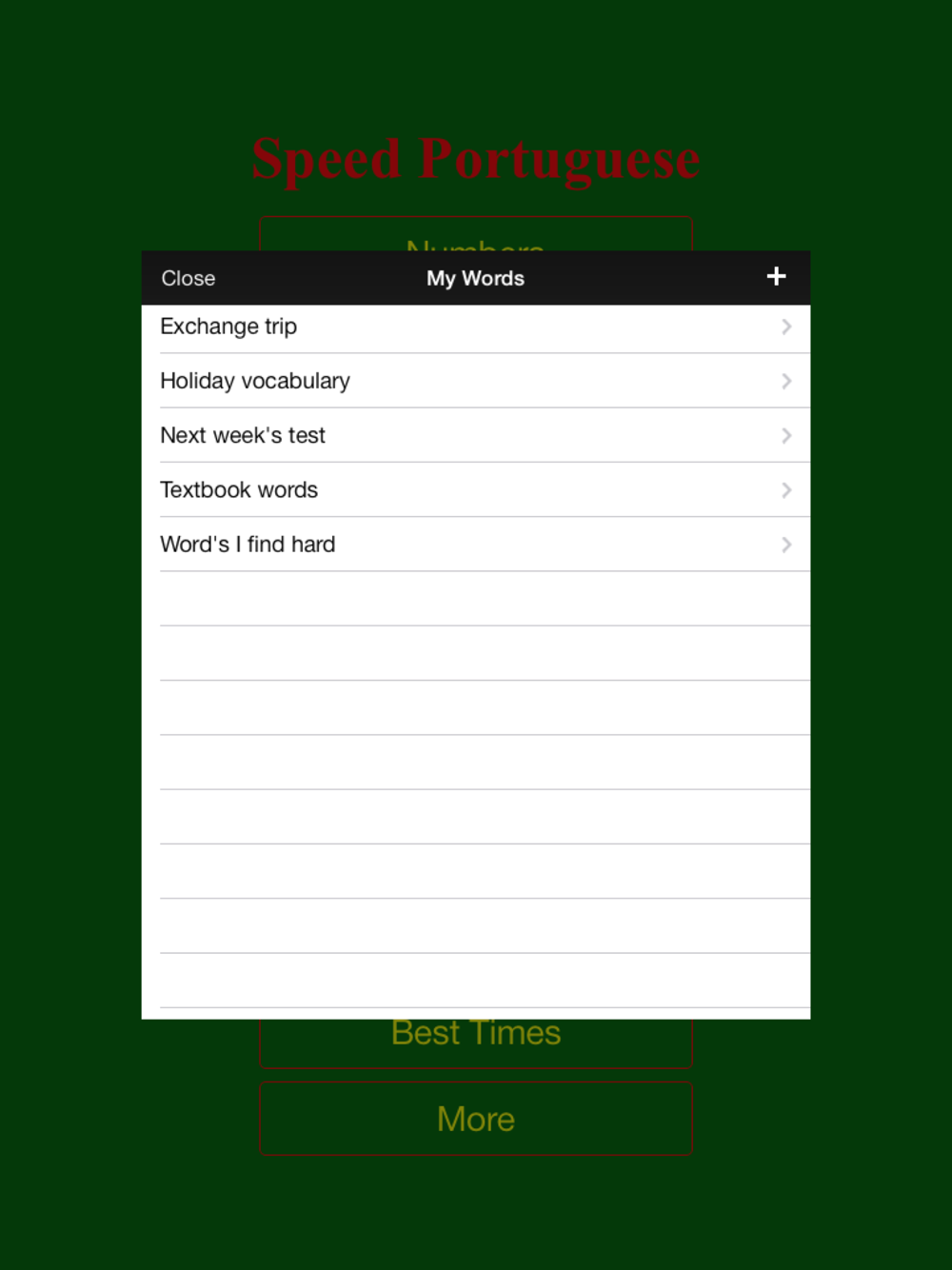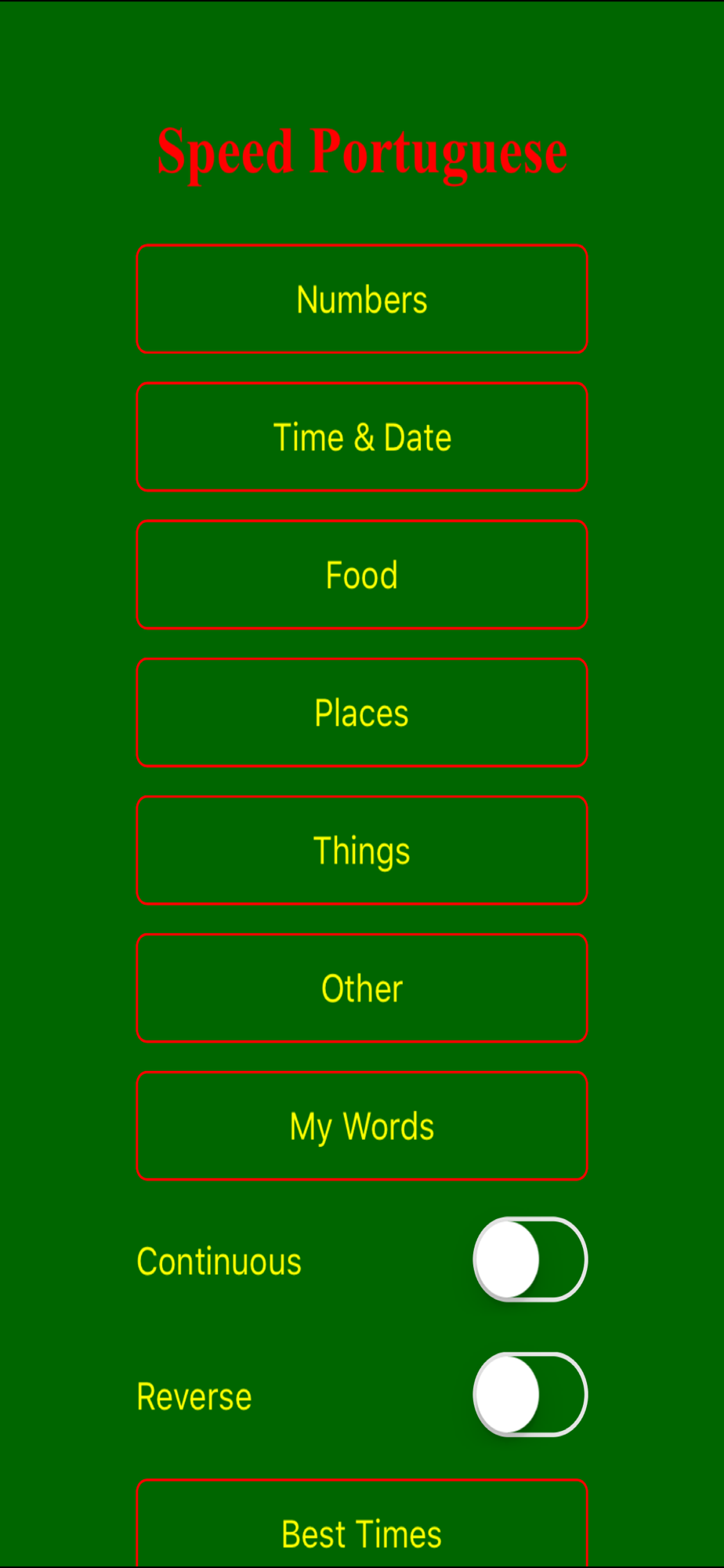 Speed Portuguese makes flash cards more powerful by giving you two choices. Unlike flash cards, you don't have to go and study a list of words and then come back and test yourself, the two choices mean you learn right from the start. With on screen score and best times its fun and easy, letting your brain do what it does best, learn to match visual patterns!