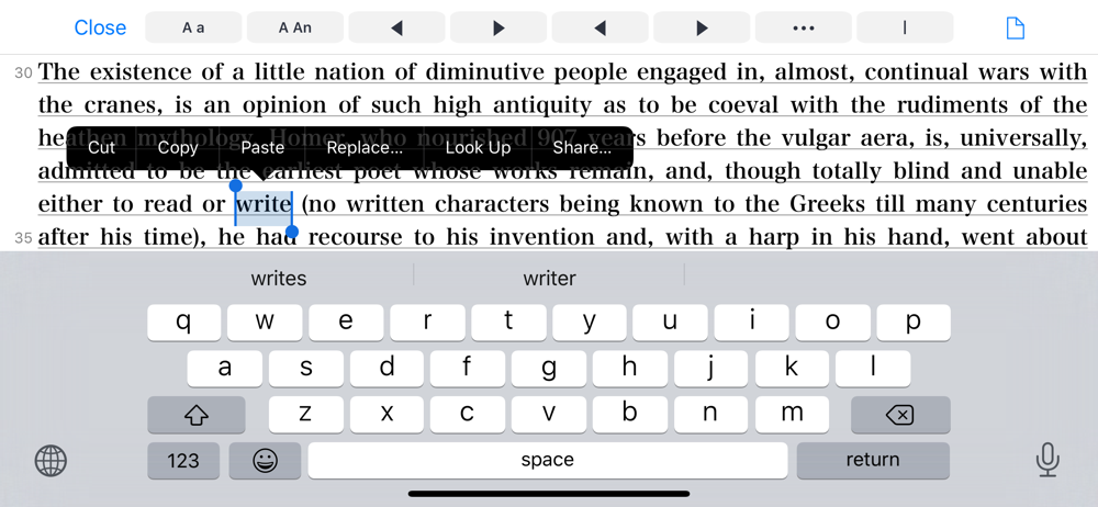 * Writing and editing are so natural - using just your fingers, and the standard onscreen keyboard and spell checker, and autocapitalize sentences help you write. Buttons like a keyboard's arrow keys do come in mighty handy to move an editing cursor to the left and the right.