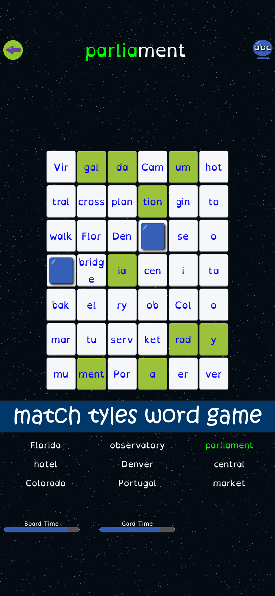 Syllable Word Search uses a unique memory card game and word search style game, that challenges players to form words by searching for syllables. Each of the 27 levels in Syllable Word Search provides increasing challenges to players.