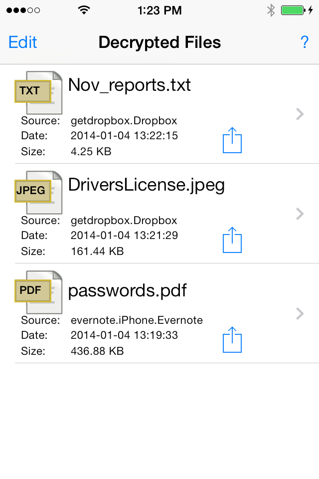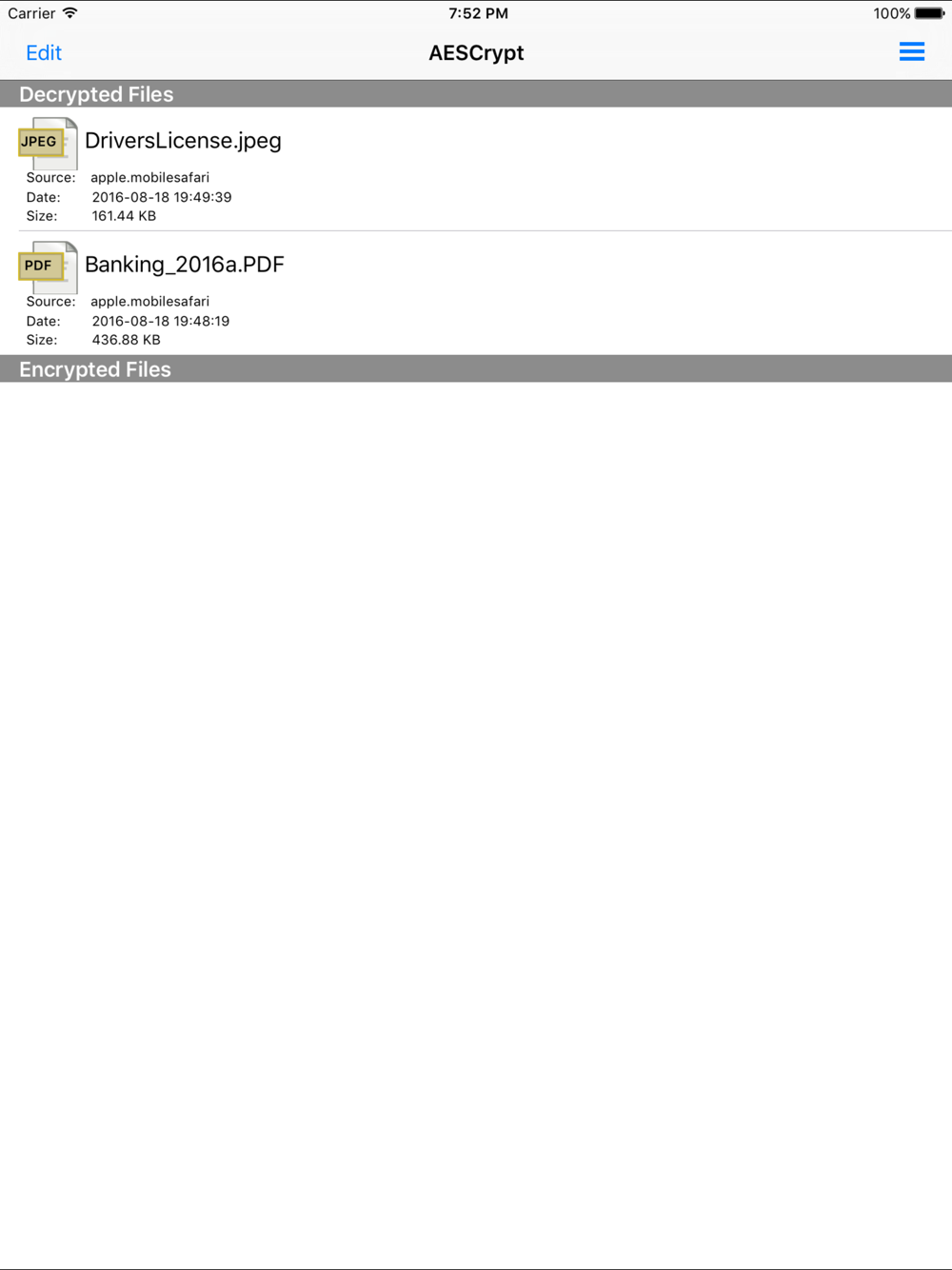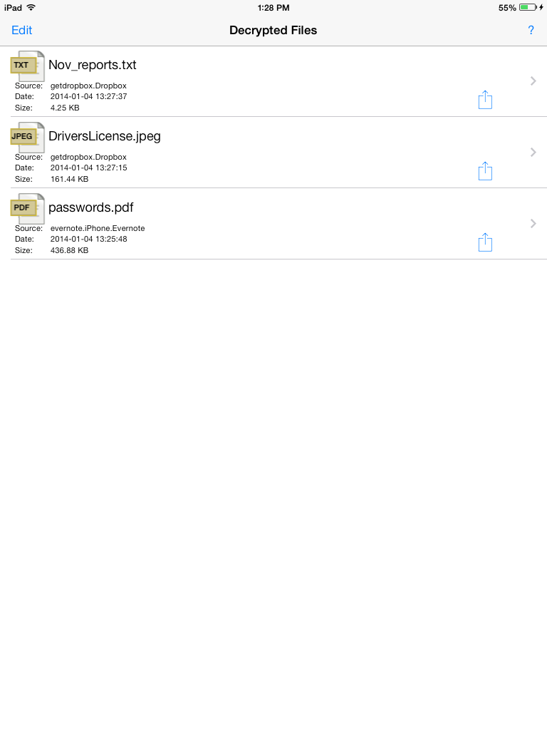 -Allows you to encrypt files right on your iOS device and store theses encrypted files in the application's file area for later export.