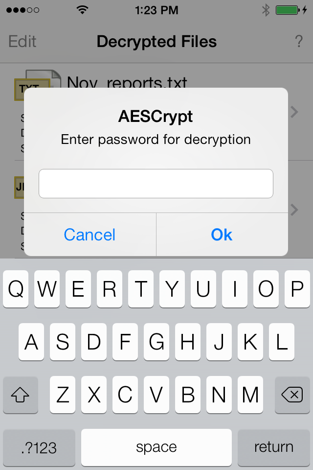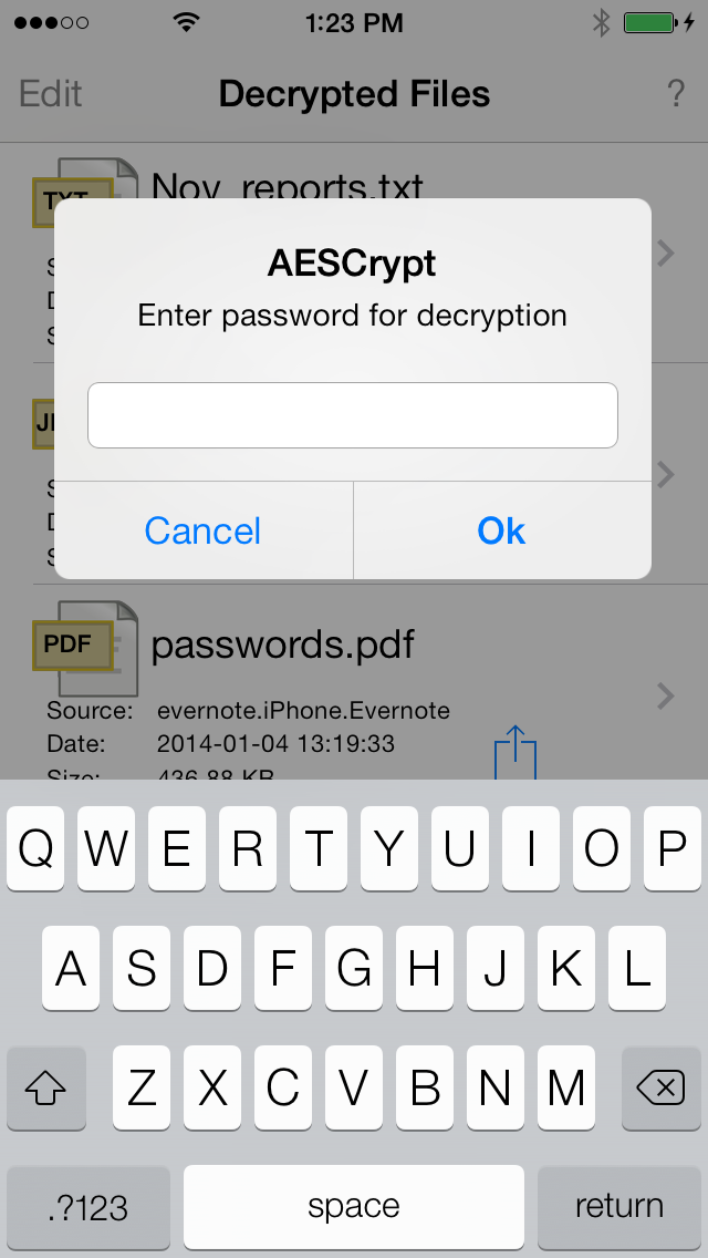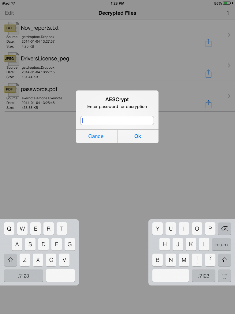 -Adds AESCrypt as an "Open In..." option for .aes files thus letting AESCrypt decrypt any file previously encrypted and saved in other cloud storage apps such as Dropbox, Email, Drive, Evernote etc.