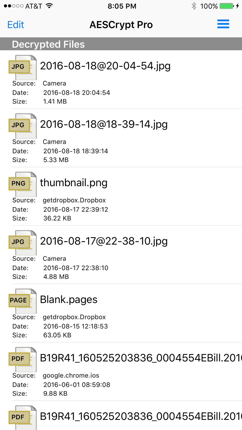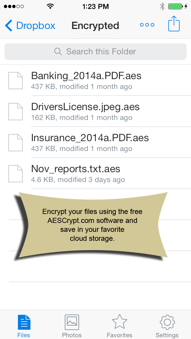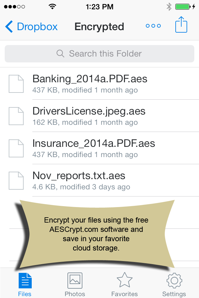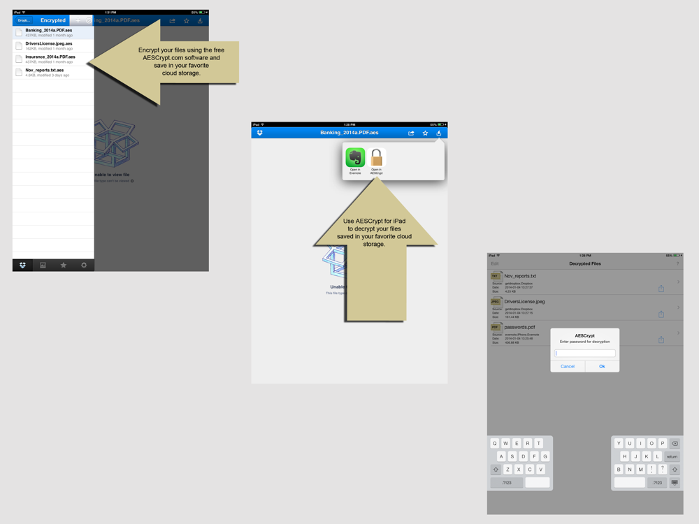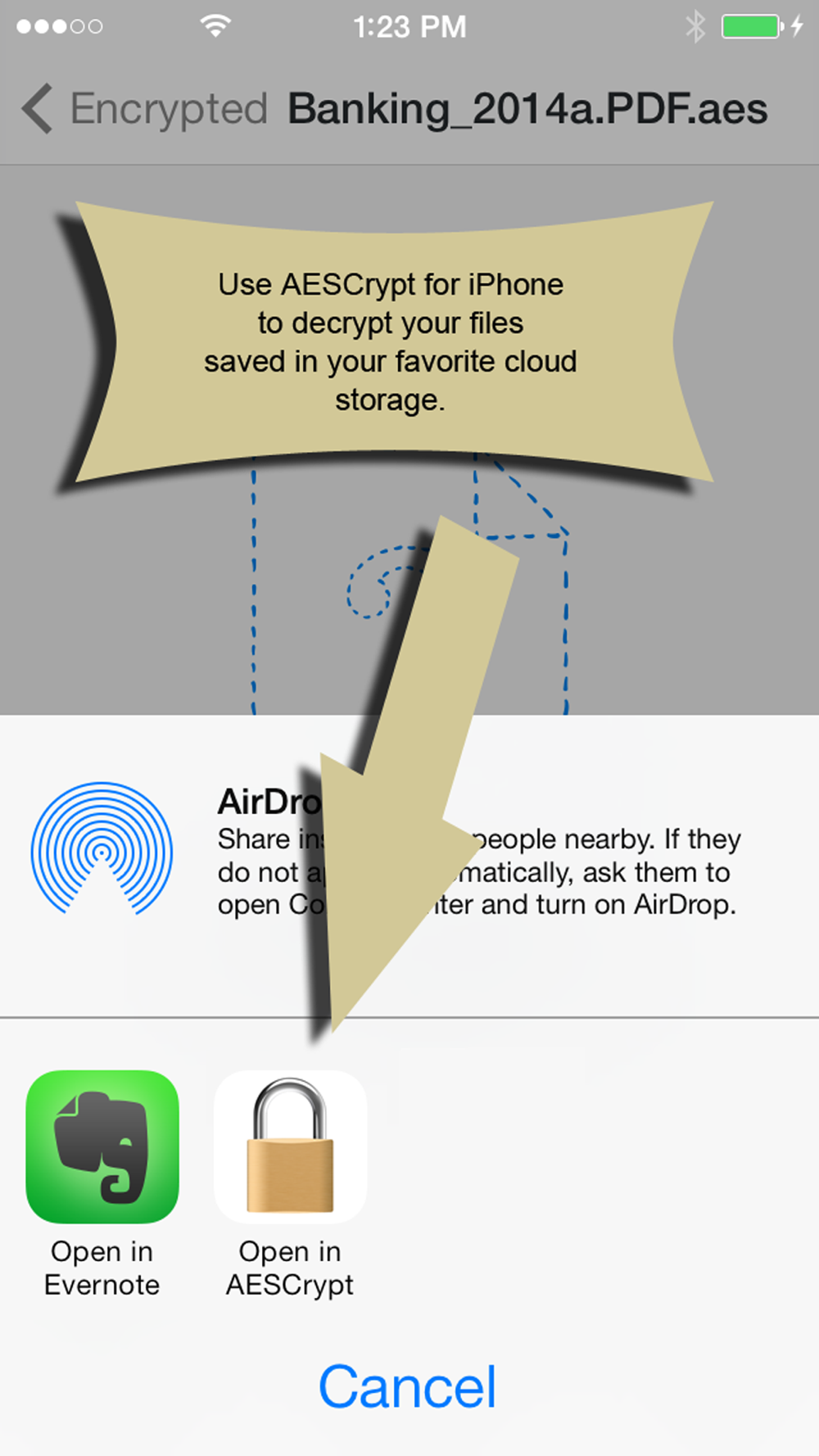 AESCrypt for iOS decrypts/previews files encrypted and saved in the cloud (Dropbox, Drive, Evernote, Email, etc). The files must be previously encrypted using the free encryption software at AESCrypt.com.