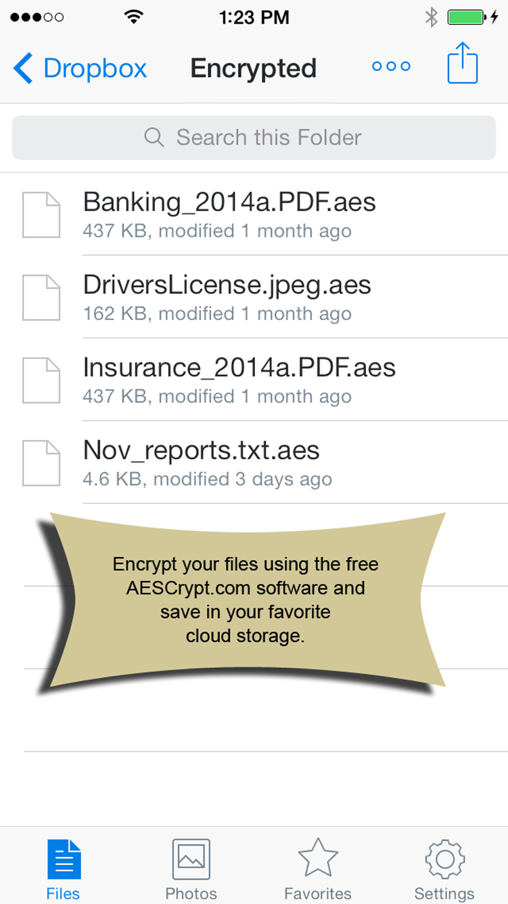 An in-app purchase/upgrade allows you to encrypt files/documents from other apps or pictures taken with the camera securely from inside AESCrypt for iOS. You can then share these encrypted files with your favorite cloud app.