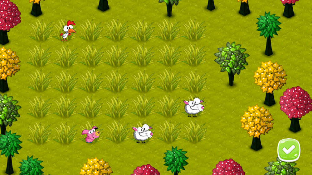 Cute cartoon graphics, with farm animals like goat, pig, sheep, donkey, cow and chicken