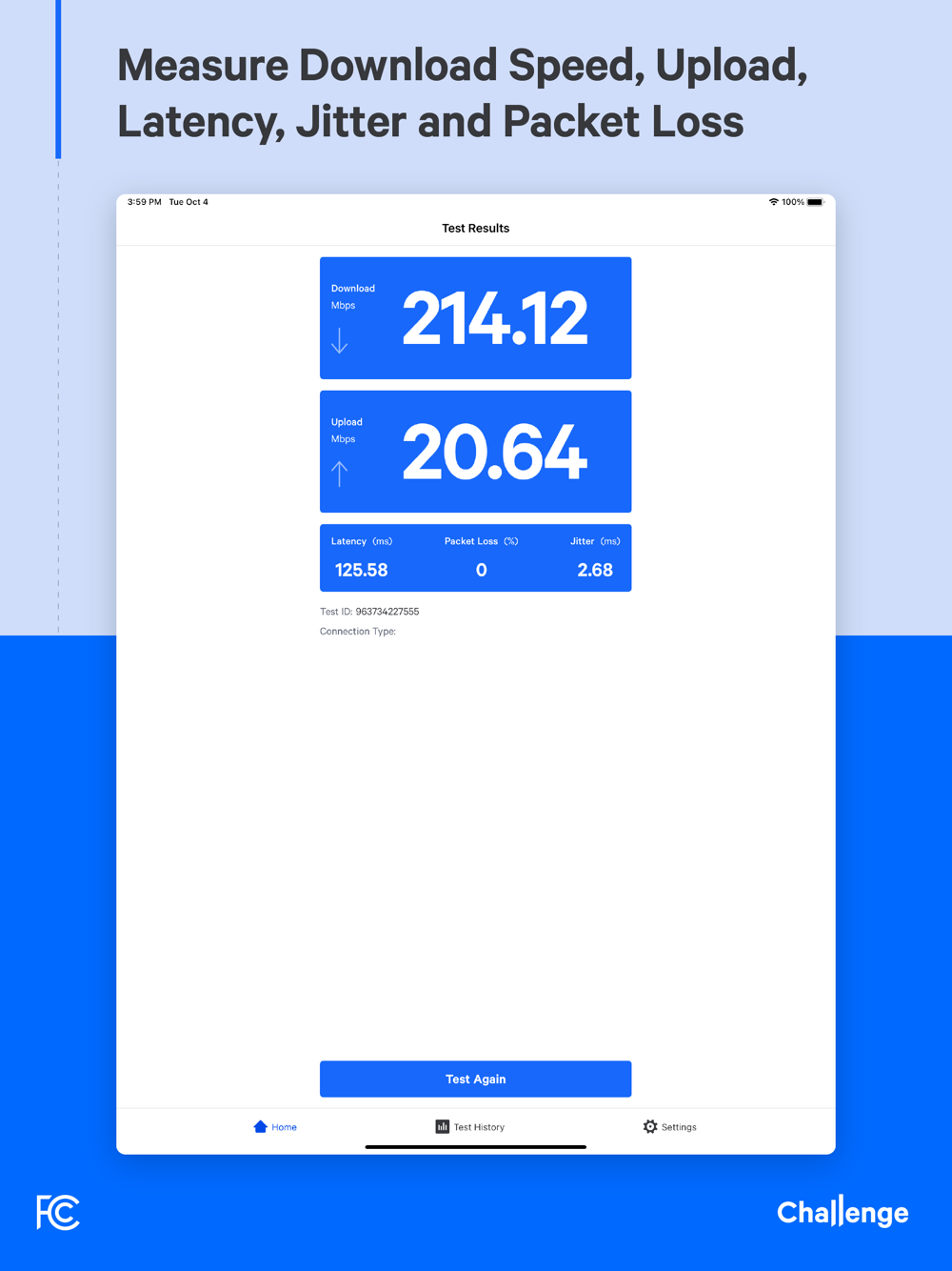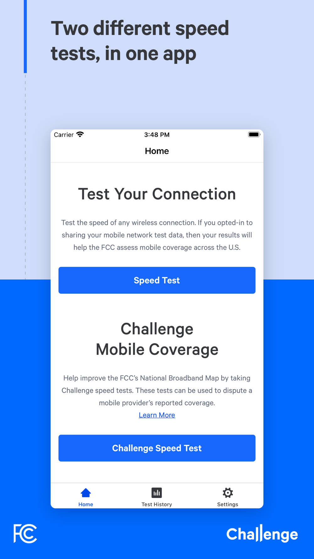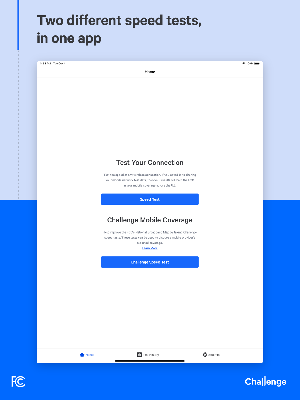 ● Run tests in Speed Test mode to check your connection or in Challenge mode to challenge wireless coverage and improve the FCC’s Broadband Map.