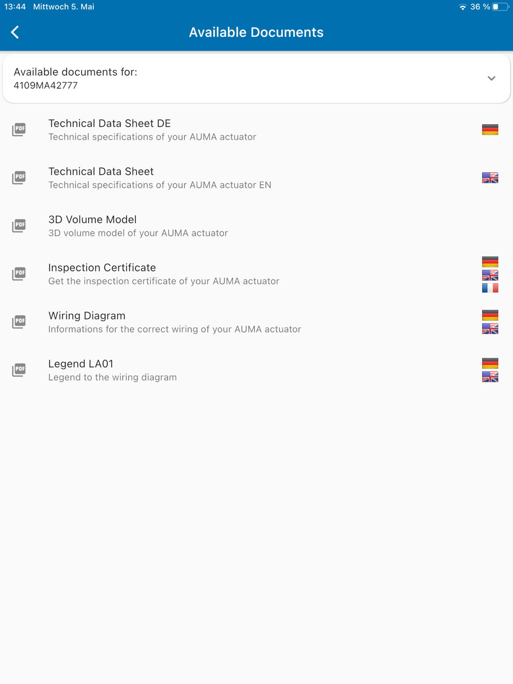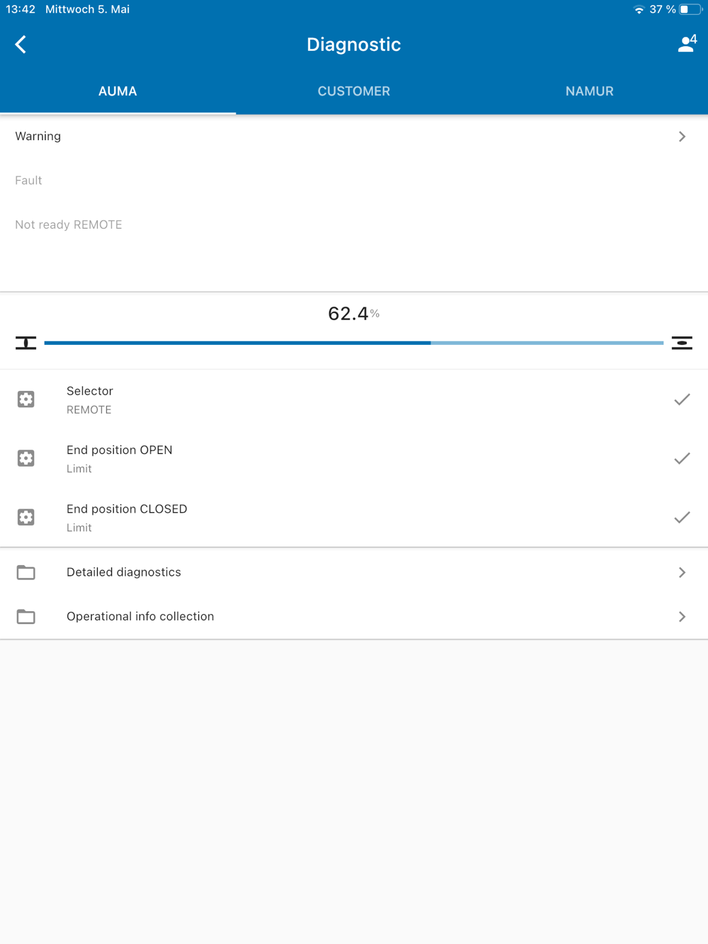 The AUMA Assistant App allows flexible and fast actuator setting and configuration using modern notebooks or smartphones. The saves both, time and money for commissioning and maintenance. The App offers comprehensive configuration and diagnostic options, easy and straightforward. Actuator connection is made via Bluetooth interface (if available at the actuator). The next objective is to enhance the communication interface for iOS also for TIGRON and AUMATIC Generation .2. This should be implemented during the few next months.