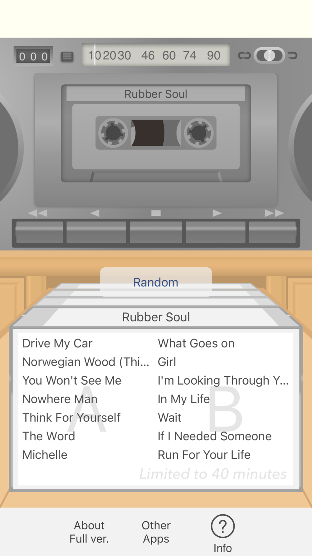 I have reproduced experiences of listening music with cassette tapes. For example, changing rotation speed of reels based on tape amount, animation of wrapping end of tape to reels, a sound of operation, song list like cassette index cards.