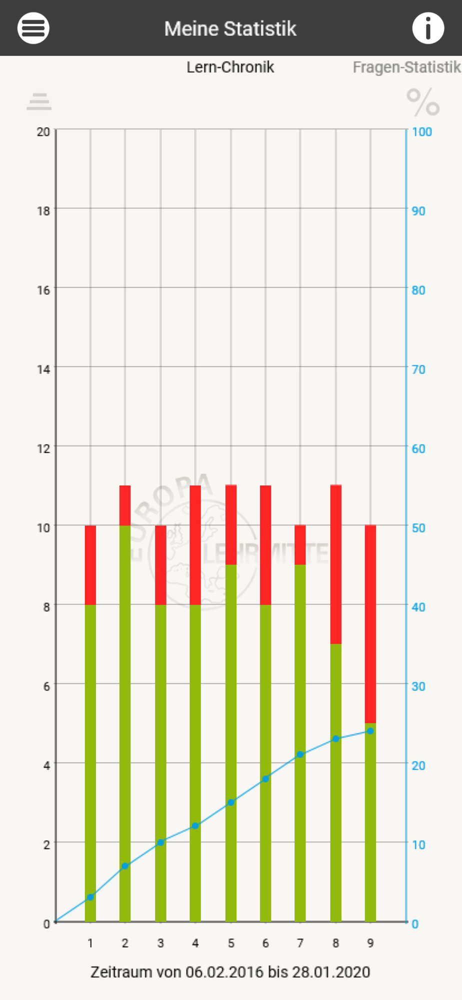 Es können entweder alle Fragen oder ausgesuchte Themenbereiche geübt werden. Die Fragen werden in verschiedenen Abständen wiederholt. Richtig beantwortete Fragen erscheinen danach seltener, falsch beantwortete häufiger (Zettelkastenprinzip). Bevorzugte Fragen können mit Bookmarks versehen und gesondert geübt werden. Während des Übens wird anhand eines Lern-O-Meters der eigene Lernstand angezeigt. Eine Statistik über die bisherigen Lernfortschritte kann jederzeit abgerufen werden.